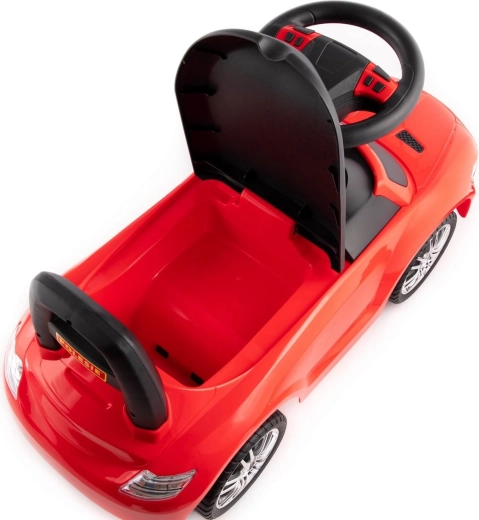 Kierownica z przyciskami i efektami dźwiękowymi (klakson, dźwięk silnika i melodie) zapewnia jeszcze więcej zabawy i stymuluje zmysły. Pod odchylanym siedziskiem znajduje się schowek na ulubione drobiazgi, które dzieci mogą mieć zawsze przy sobie.