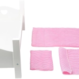 W skład łóżeczka wchodzi miękka poduszka, kocyk i prześcieradło z różowym wzorem, zapewniające maksymalny komfort lalkom.
