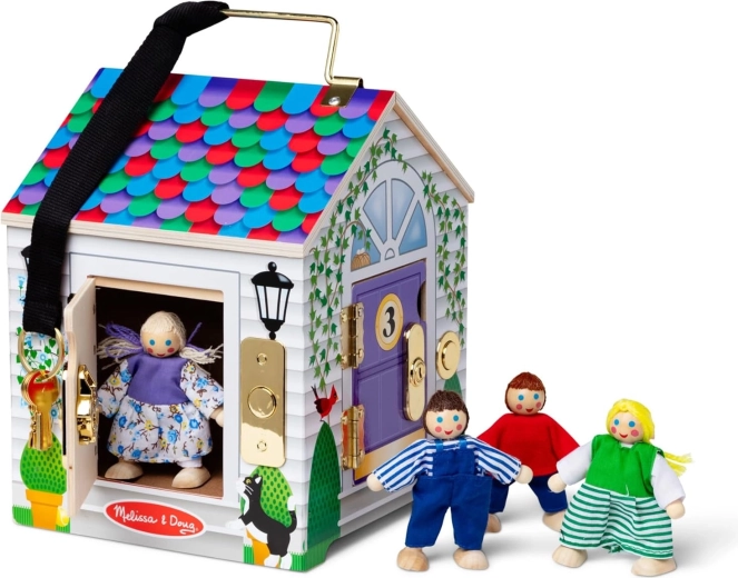 Solidne, drewniane wykonanie od MELISSA & DOUG wytrzymuje codzienną zabawę. Dzięki praktycznemu uchwytowi domek idealnie sprawdzi się także w podróży.