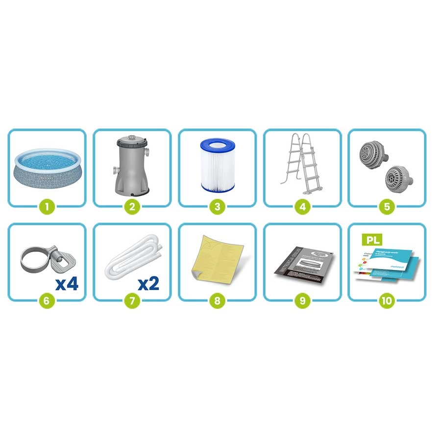 - Pompa filtrująca, wkład typu II, węże i złączki, bezpieczna drabinka z wyjmowanymi stopniami, łatka naprawcza, instrukcja