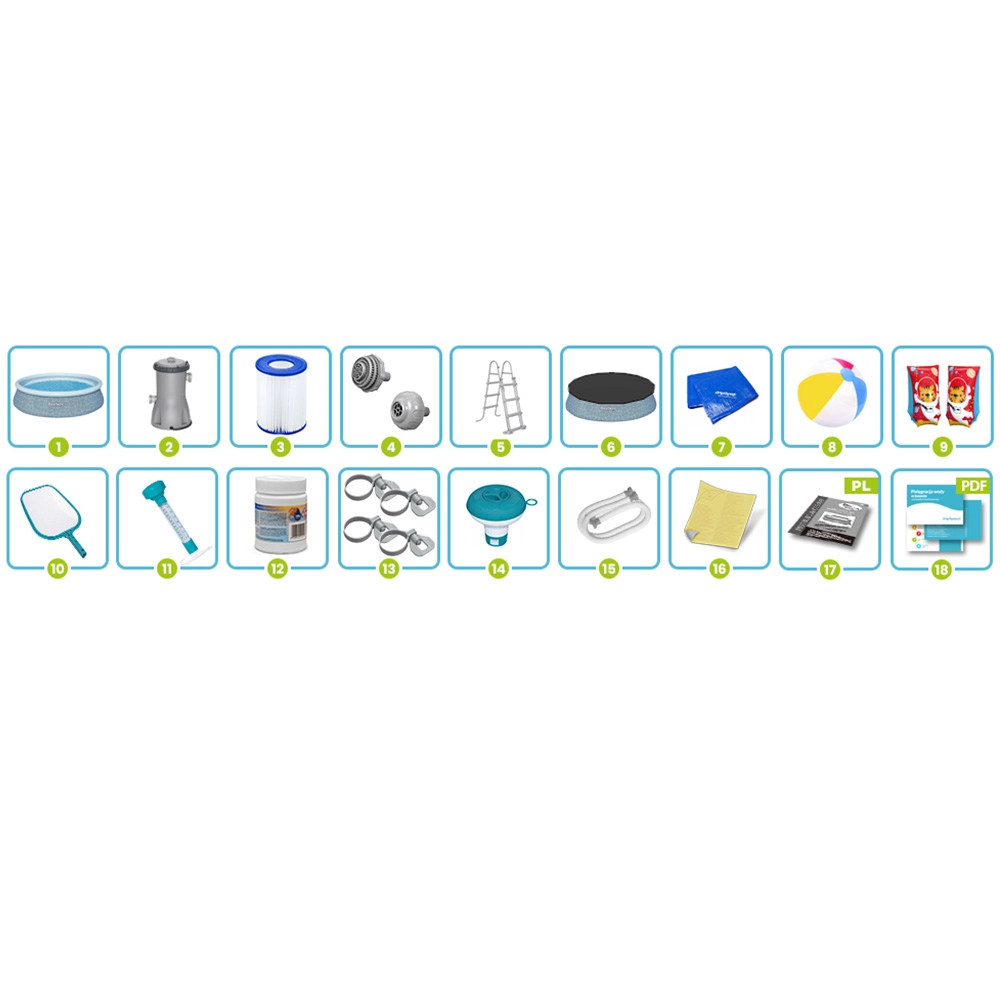 W komplecie znajduje się pełny zestaw 18w1 do natychmiastowego użytku: wydajna pompa filtrująca 2006 l/h z filtrem typu II, drabinka bezpieczeństwa z odpinanymi stopniami, pokrywa i mata pod basen dla dłuższej żywotności, a także siatka do zanieczyszczeń, termometr, dozownik chemii oraz multitabletki dla krystalicznie czystej wody. Nie zabrakło piłki plażowej, rękawków do pływania, łatki naprawczej i instrukcji w języku czeskim.