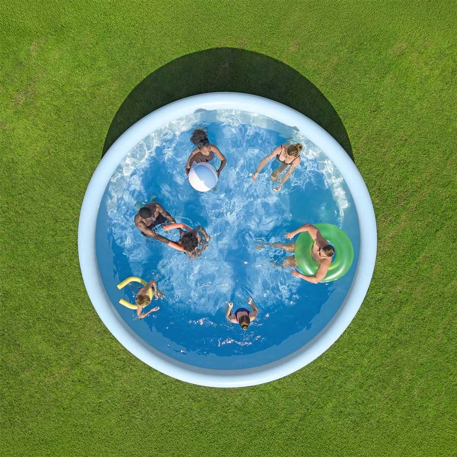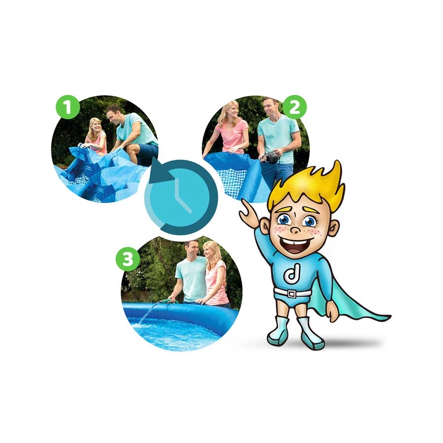 Samonośna konstrukcja z nadmuchiwanym górnym pierścieniem pozwala rozstawić basen w kilku krokach: rozłożyć, napompować, napełnić. Idealne rozwiązanie na szybki start sezonu.