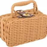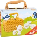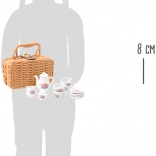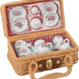 Elegancki porcelanowy zestaw kawowy w wiklinowej walizce z romantycznym nadrukiem. Idealny do dziecięcych zabaw w pikniki lub herbatki z lalkami.