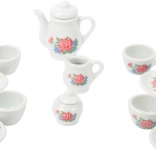 Ten wspaniały porcelanowy zestaw kawowy zawiera 14 elementów naczyń, w tym duży dzbanek, dzbanek na mleko, cukiernicę i cztery filiżanki ze spodkami. Wszystko elegancko umieszczone w wiklinowej walizce z czerwono-białą kraciastą tkaniną. Wzór z różami dodaje romantycznego charakteru, co czyni ten zestaw idealnym do wyimaginowanych herbatek na świeżym powietrzu i w domu.