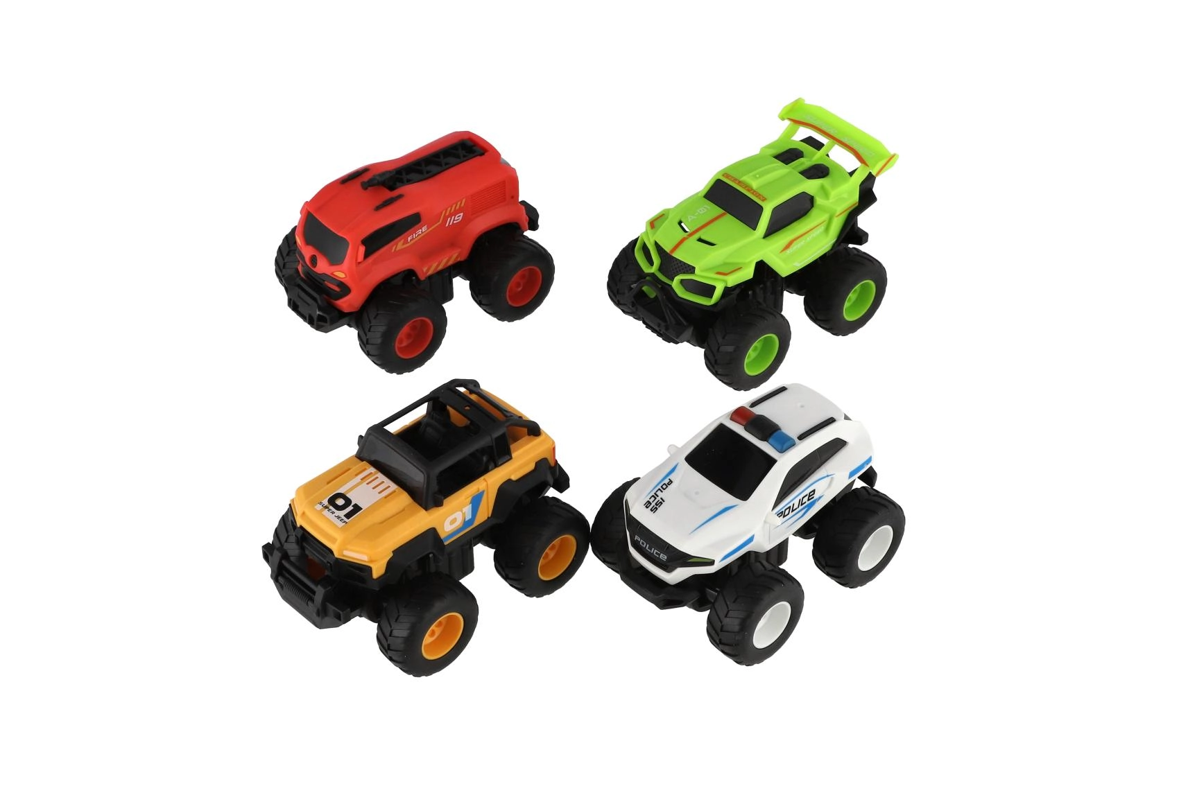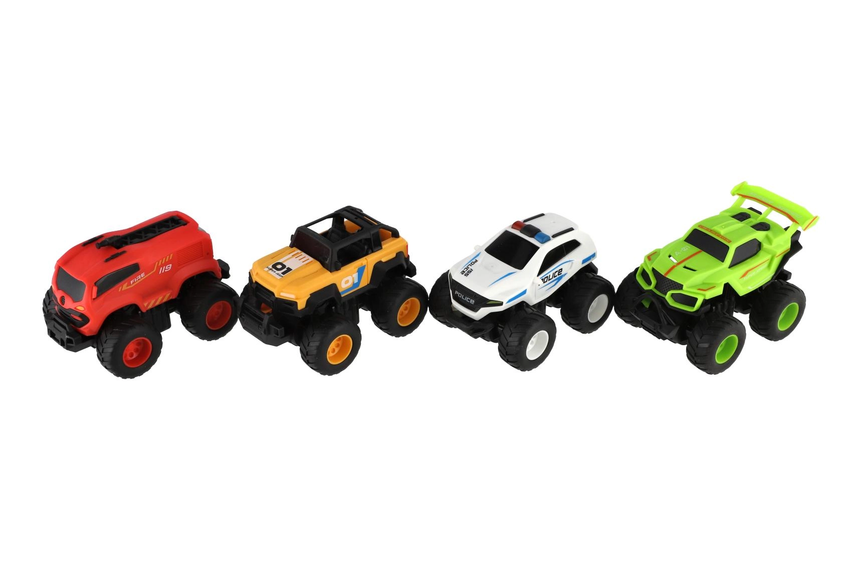W zestawie znajdziesz wersje wyścigową, policyjną i strażacką oraz sportowego monster trucka – świetne do zabaw w odgrywanie ról i kolekcjonowania.
