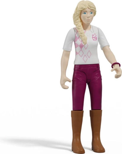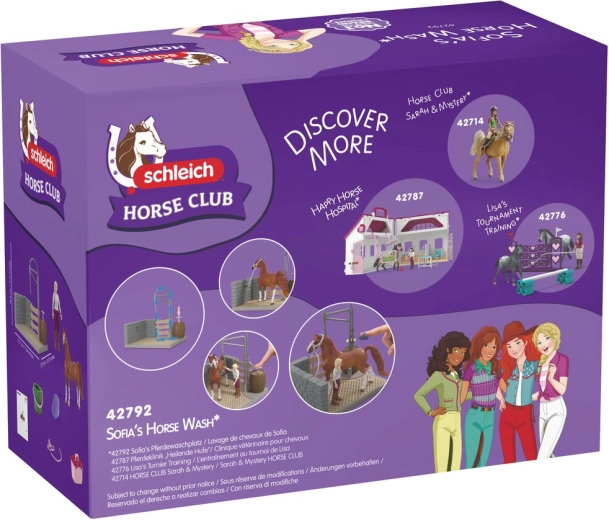 W skład zestawu wchodzi figurka Sofie, piękny amerykański koń siodłowy wałach oraz bogate akcesoria – wąż, wiadro, szczotka, stajenny kantar i uwiąz. Realistyczne detale, stabilna podstawa i gumowa wkładka pod nogami konia dodają zabawie pewności i wiarygodności.