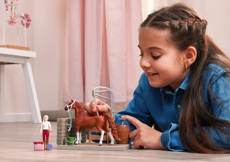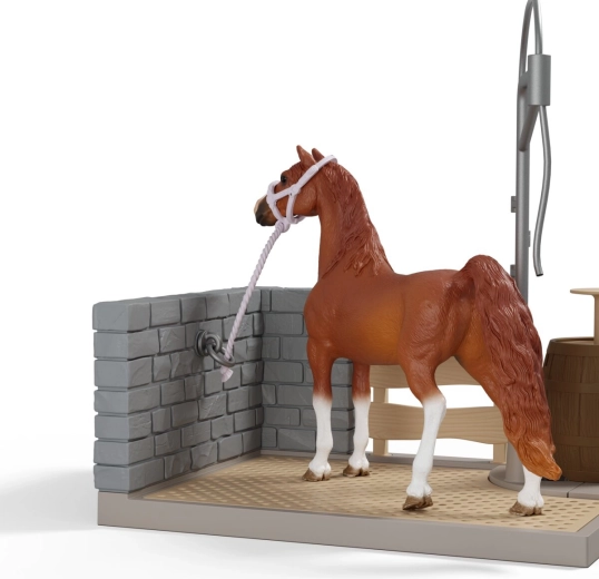 Myjnia dla koni Sofie od SCHLEICH HORSE CLUB zapewnia dzieciom autentyczną zabawę w opiekę nad końmi. Sofie za pomocą pompki przepompowuje wodę z beczki do prysznica, obrotowe ramię gwarantuje dokładne umycie ze wszystkich stron, a woda następnie spływa do tacki ociekowej i wraca do beczki. To oznacza mniej bałaganu i więcej zabawy.