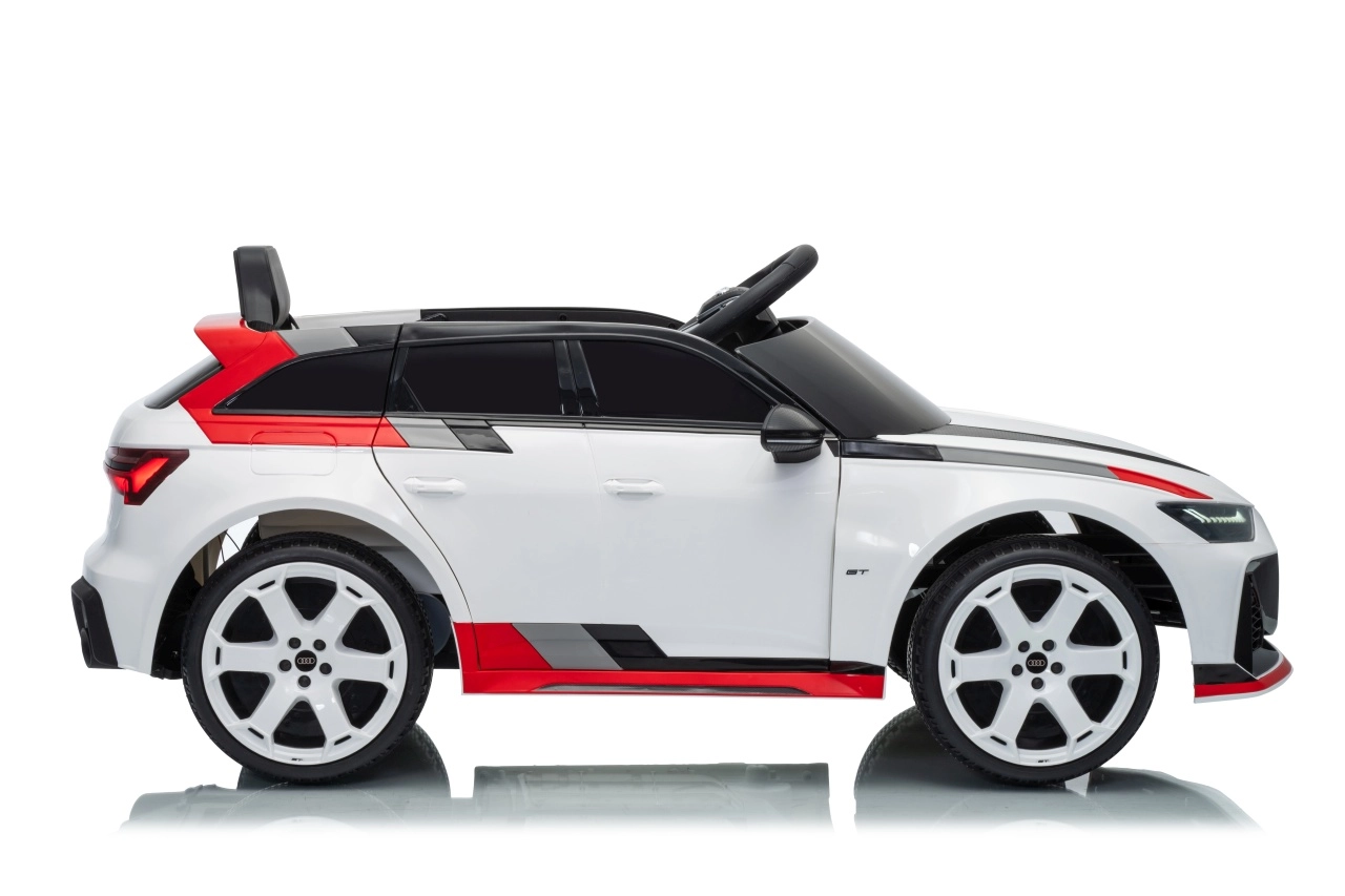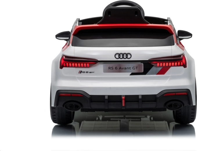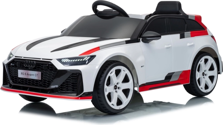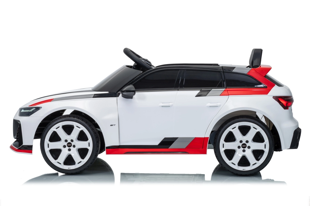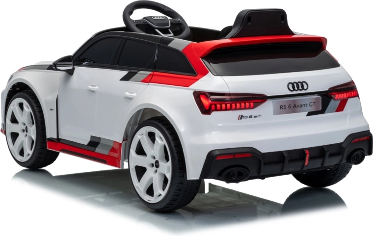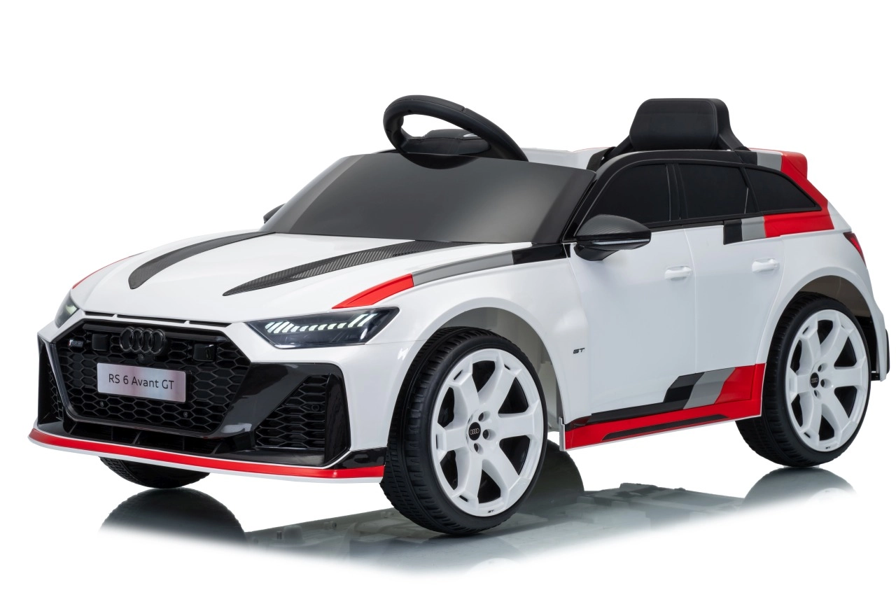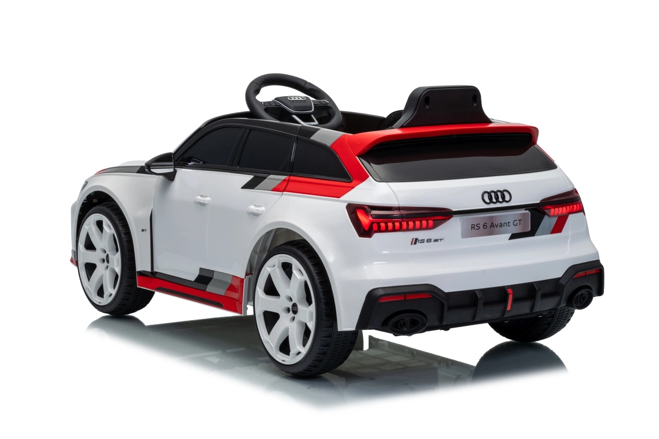 Stylowy dziecięcy elektryczny samochodzik AUDI RS 6 AVANT GT w kolorze białym oferuje wydajne silniki 4×35 W, akumulator 12 V 9 Ah, zdalne sterowanie 2,4 GHz z blokadą awaryjnego zatrzymania, miękkie koła EVA, skórzane siedzenie z pasami oraz przednie i tylne światła LED. Realistyczny wygląd, płynny start i bogaty panel audio z Bluetooth, MP3, USB i AUX zapewnią dzieciom bezpieczną i pełną zabawy jazdę.
