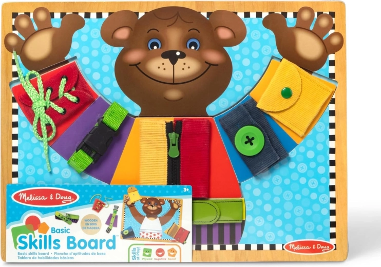 Kolorowa drewniana tablica manipulacyjna z misiem od Melissa & Doug rozwija małą motorykę, koordynację ręka–oko oraz samodzielność przy ubieraniu. Dzieci w bezpieczny sposób ćwiczą zamki błyskawiczne, klamry, guzik, zatrzask/przycisk oraz sznurowanie na sześciu odpinanych tekstylnych elementach z solidną drewnianą podstawą.