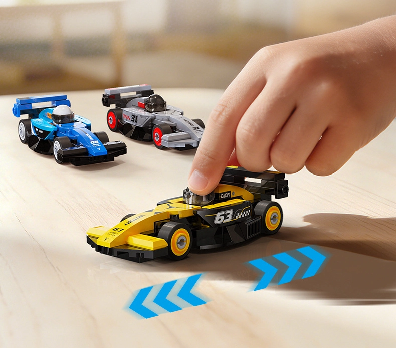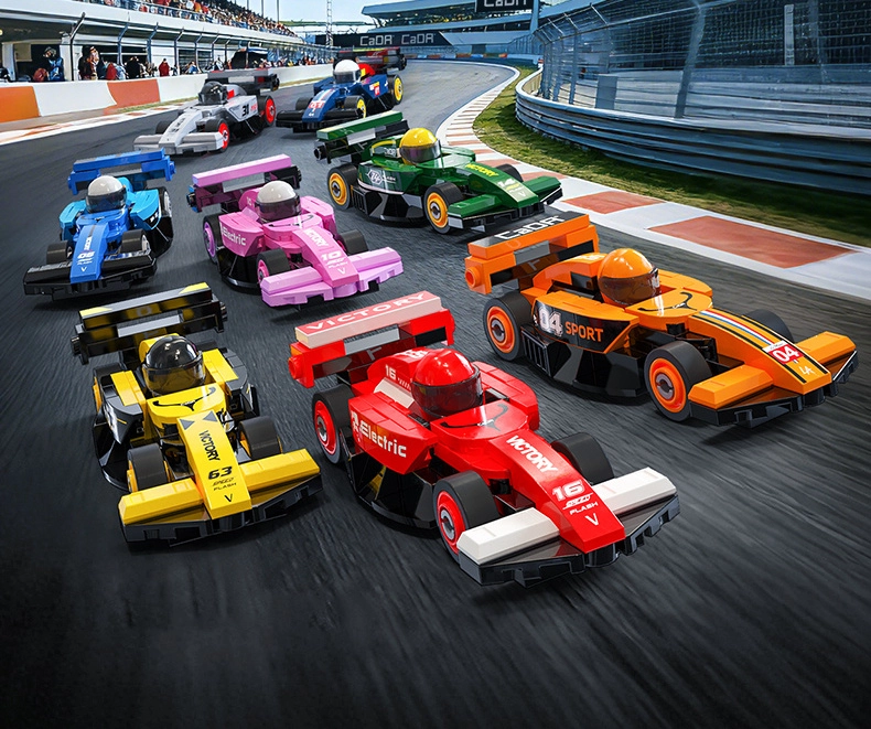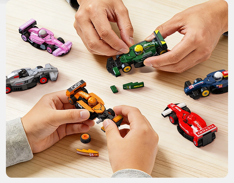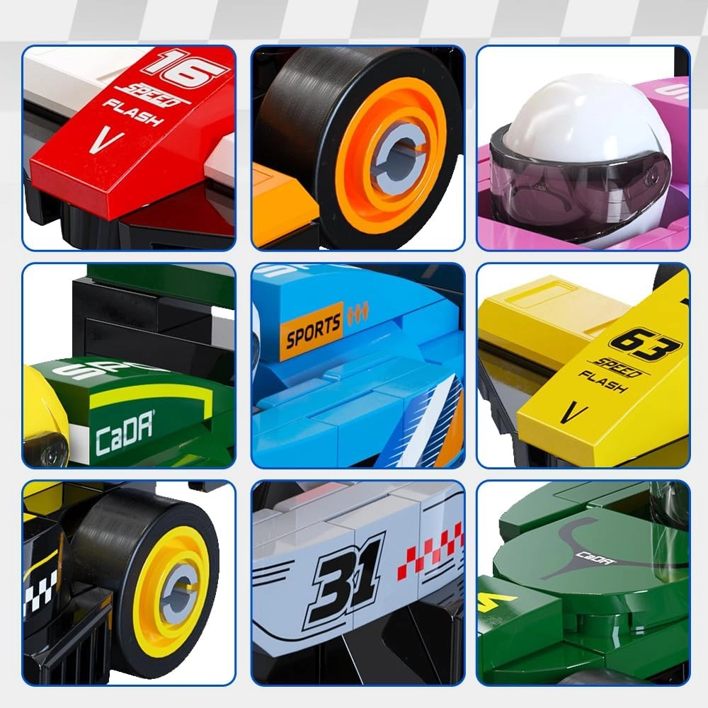 Ten designerski zestaw oferuje 8 różnych mini wyścigowych bolidów, każdy z około 70 elementów. Po złożeniu powstają kompaktowe modele o wymiarach ok. 10 × 4 × 3 cm, które świetnie jeżdżą po równej powierzchni i doskonale prezentują się jako kolekcja na półce. Elementy są kompatybilne z innymi zestawami CADA, więc możesz dalej modyfikować i łączyć pojazdy.