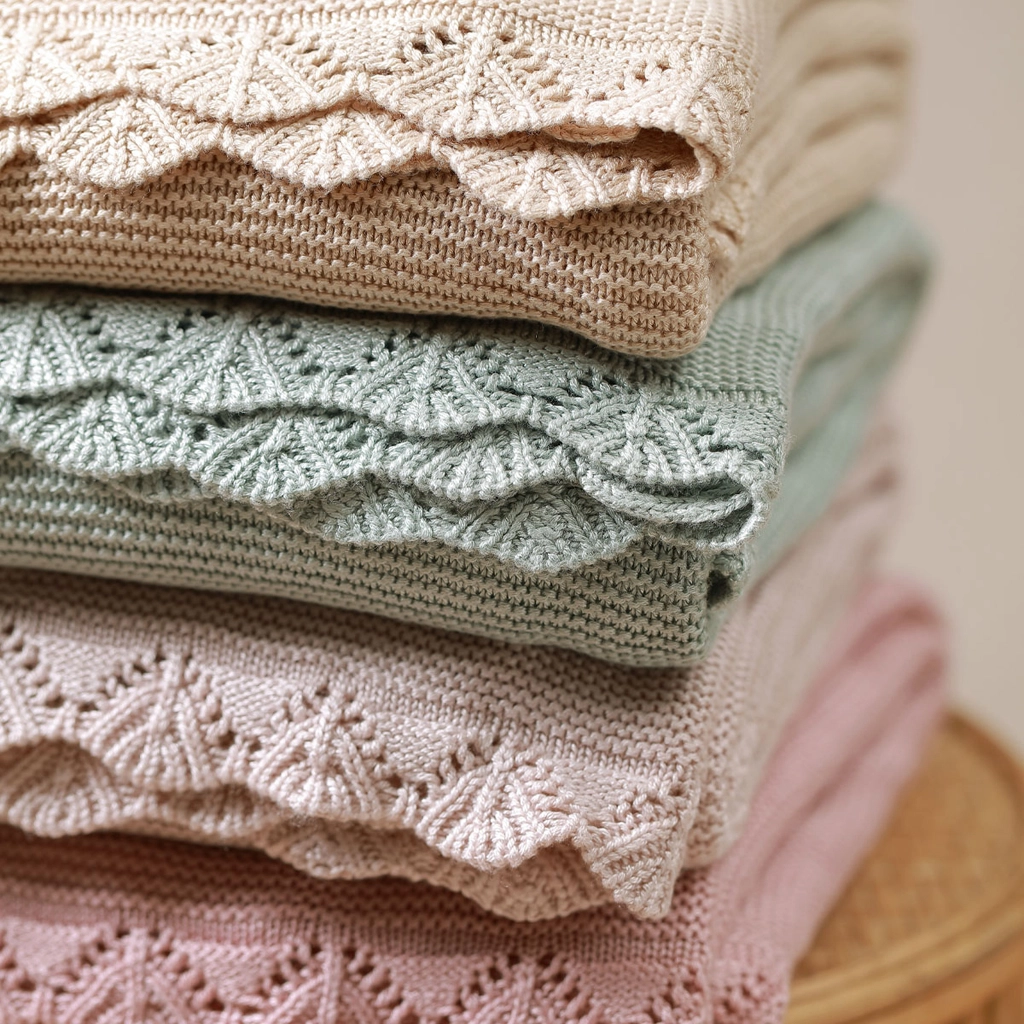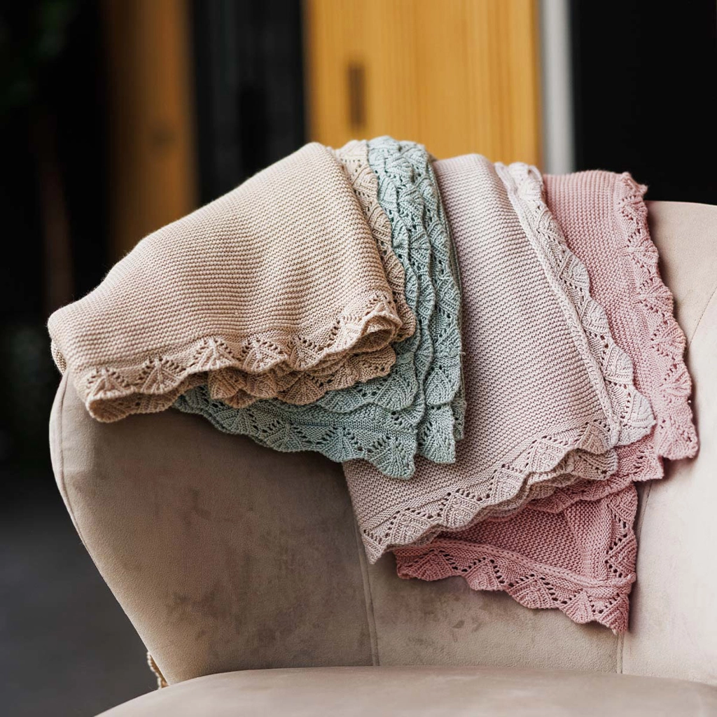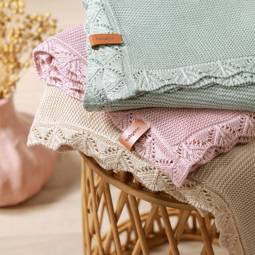 Delikatny róż, dekoracyjna krawędź i rozmiar 75 × 100 cm sprawiają, że to idealny dodatek do wózka, łóżeczka i w podróży.