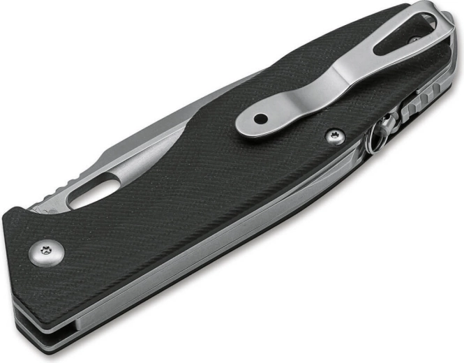 Rękojeść z czarnego G10 ma przyjemną teksturę, nie ślizga się w dłoni, a wraz ze stalowymi wkładkami nadaje nożowi sztywność. Praktyczne detale, takie jak klips do kieszeni, otwór na paracord i zintegrowany zbijak do szyb, zwiększają użyteczność w codziennym noszeniu oraz w terenie.