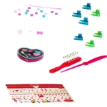 W opakowaniu znajdziesz grzebień, szczotkę, małe klipsy, koraliki, wstążki, naklejki oraz paletkę – wszystko do stylizacji i zdobienia.