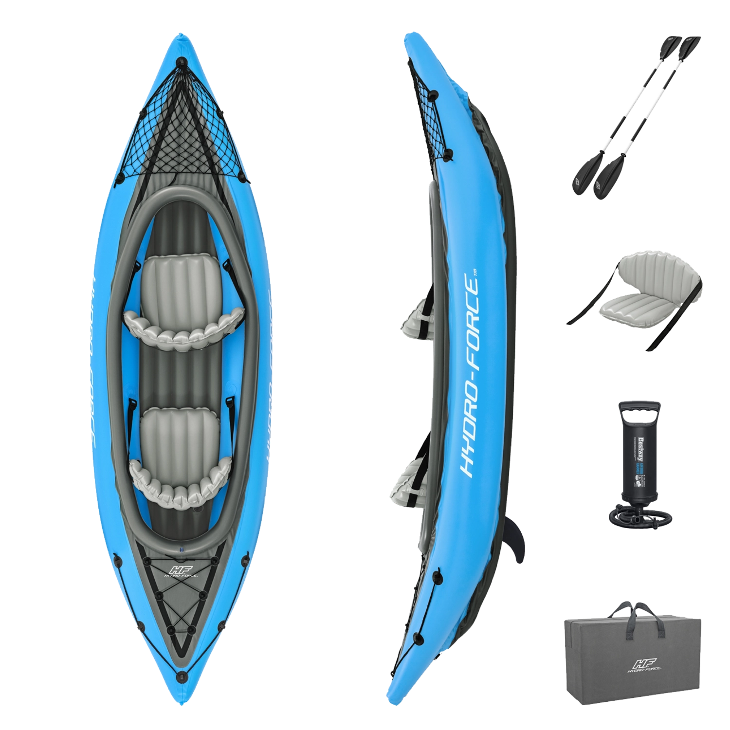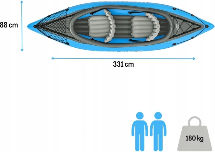 Dwa nadmuchiwane siedzenia z oparciem zapewniają podparcie pleców. Przednia i tylna siatka bungee pomieszczą przekąski, kurtkę i drobny sprzęt – wszystko masz pod ręką.