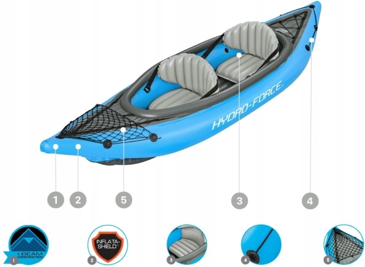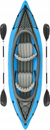 - Kompletny zestaw gotowy do wody: kajak, 2 wiosła, pompka, płetwa, łatka, torba
