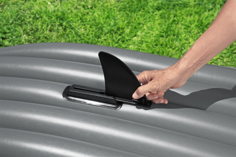 Praktyczne elementy, takie jak przednia i tylna siatka bungee do przechowywania rzeczy, obwodowa lina do chwytania ułatwiająca manewrowanie oraz zawory szybkiego zamykania do szybkiego pompowania/odpompowywania oszczędzają czas i miejsce. Wyjmowana płetwa (skeg) w różnych rozmiarach pomaga utrzymać prosty kierunek i poprawia manewrowość.