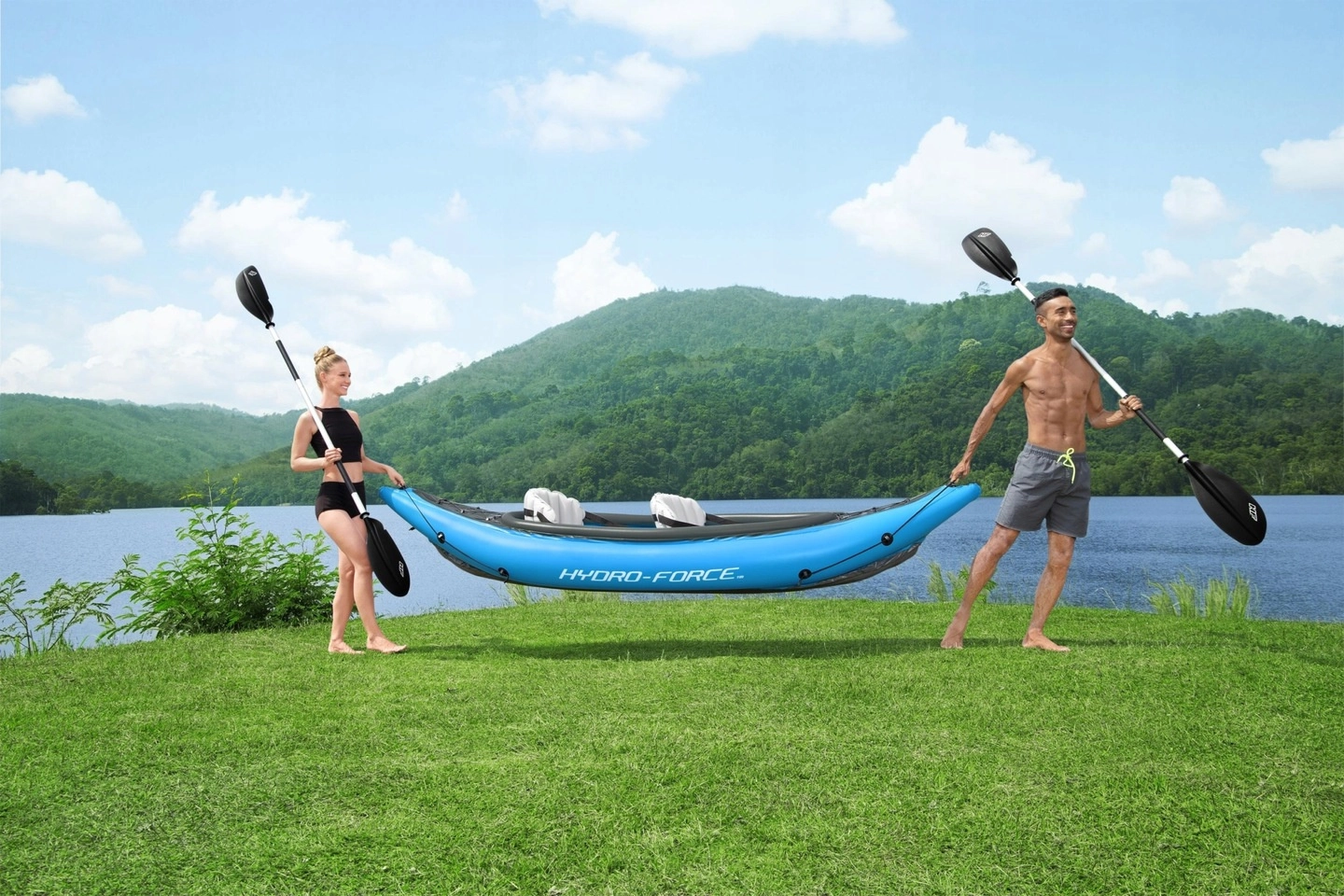 W zestawie otrzymujesz kajak dla 2 osób, dwa dwupiórowe wiosła, ręczną pompkę Air Hammer, wyjmowaną płetwę/skeg, łatkę naprawczą oraz torbę transportową – możesz ruszać od razu.