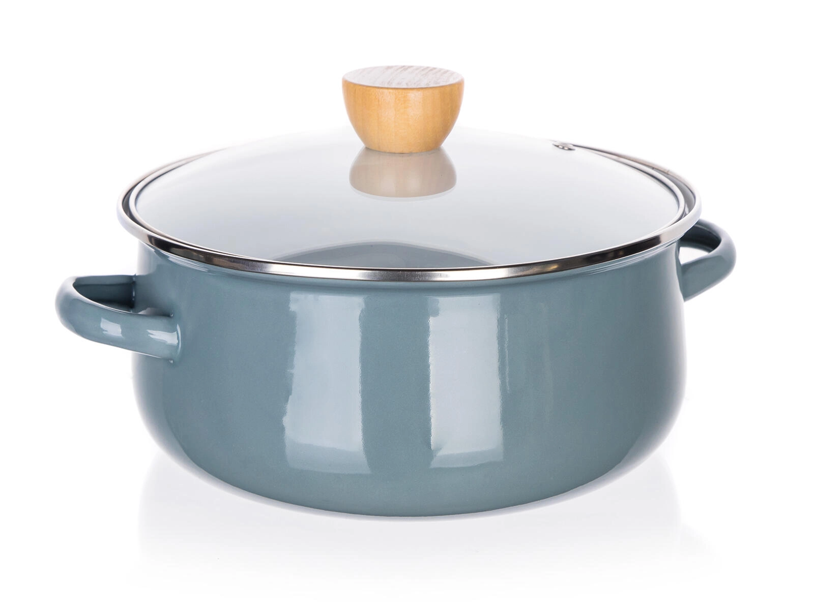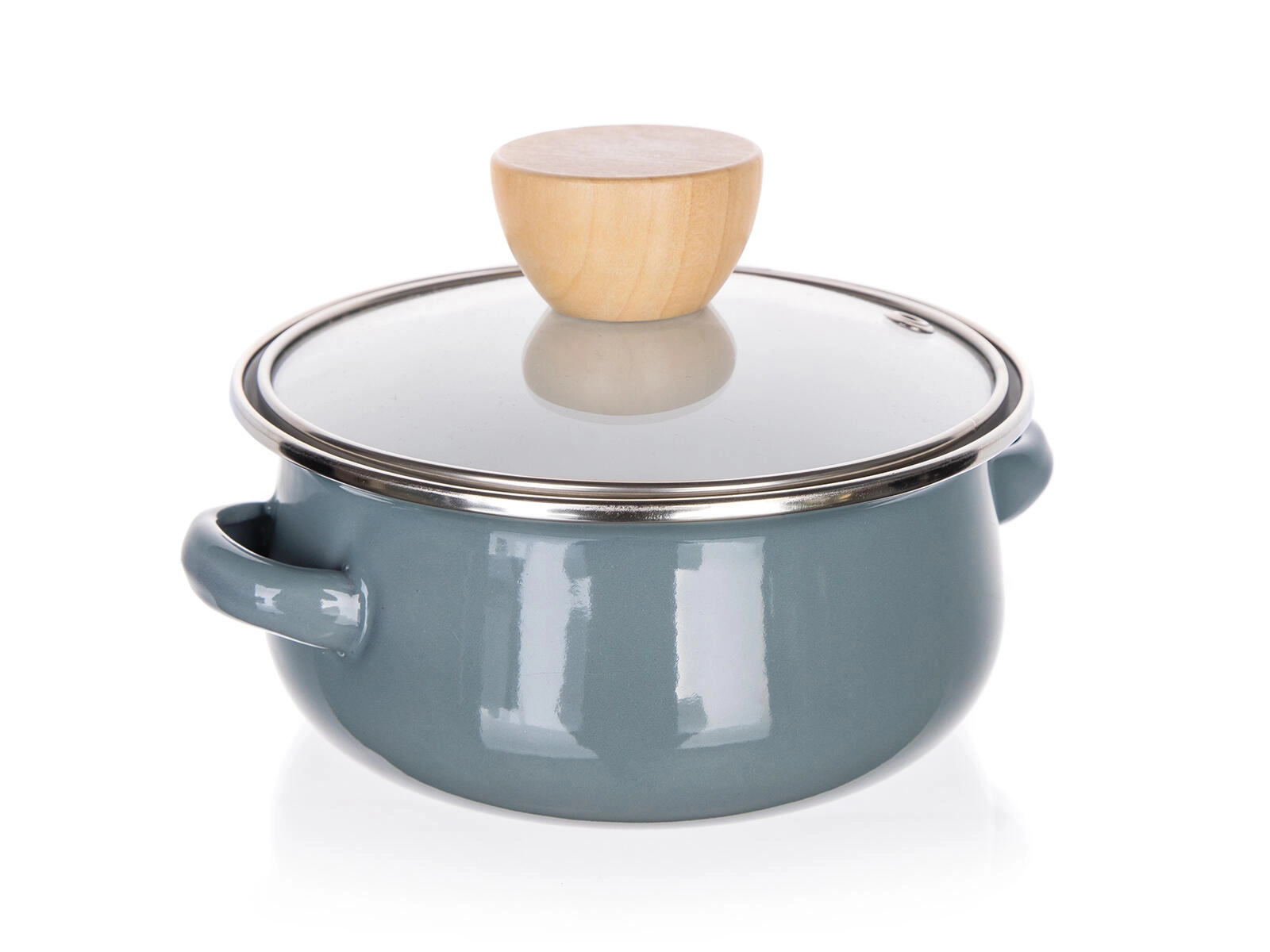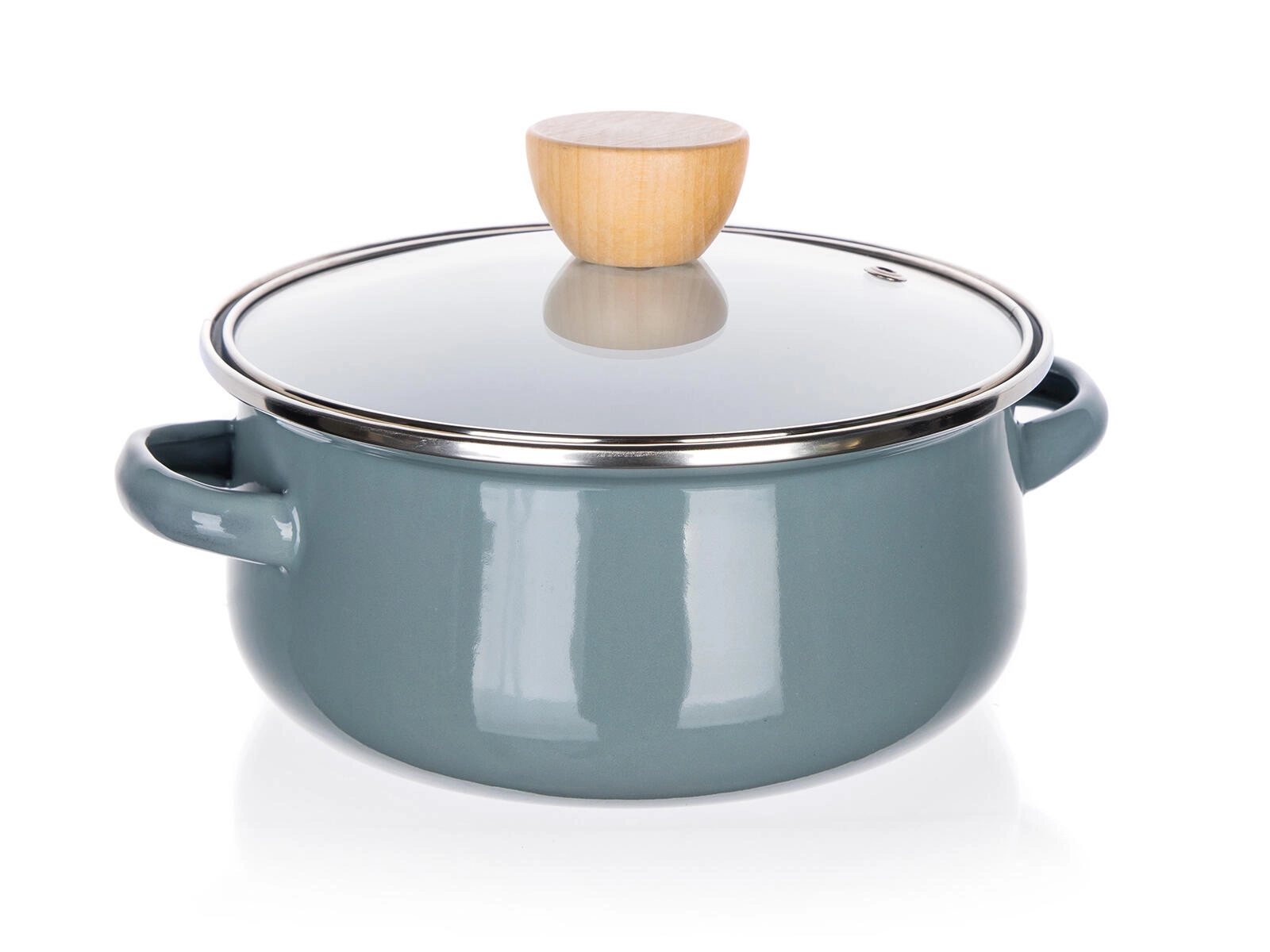 Elegancki zestaw emaliowanych garnków w naturalnym odcieniu oliwki do codziennego gotowania. Zawiera trzy rozmiary z przezroczystymi szklanymi pokrywkami i solidnymi uchwytami. Trwała, 2-warstwowa emalia SOLID zapewnia długą żywotność, łatwą pielęgnację i równomierne rozprowadzanie ciepła. Garnek można używać również w piekarniku bez szklanej pokrywki z drewnianym gałką.