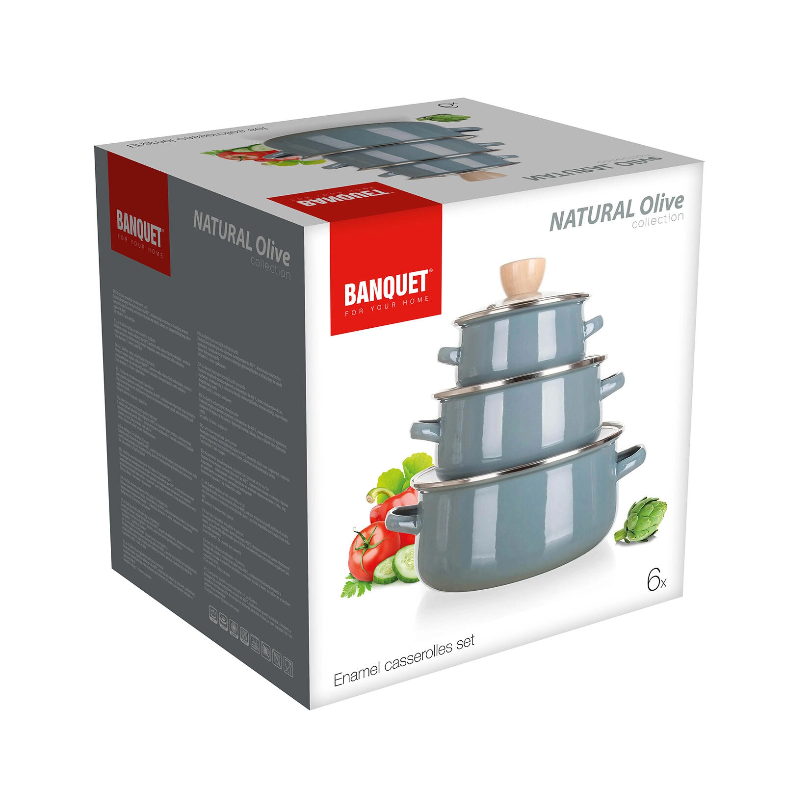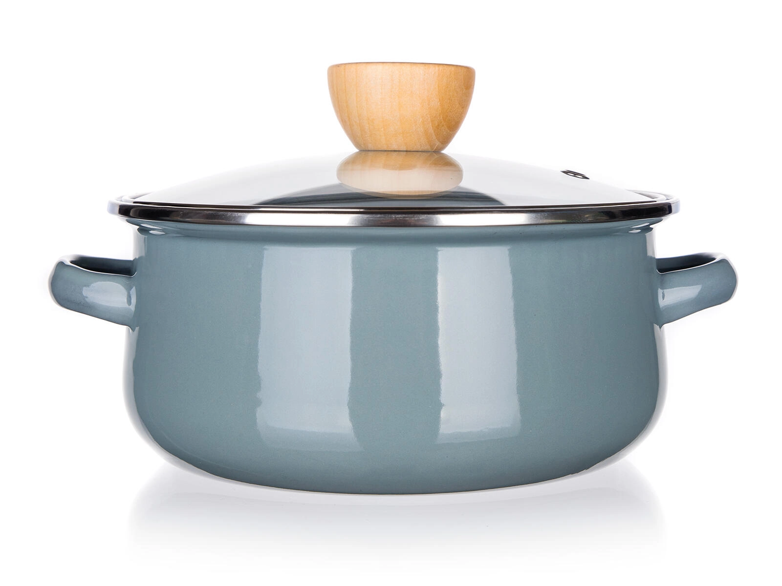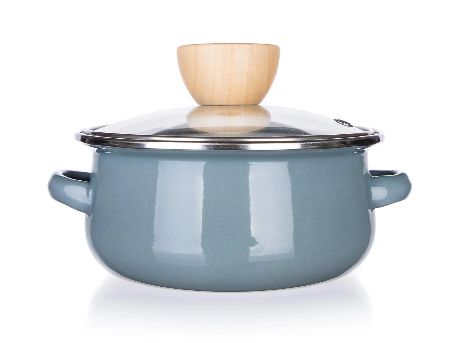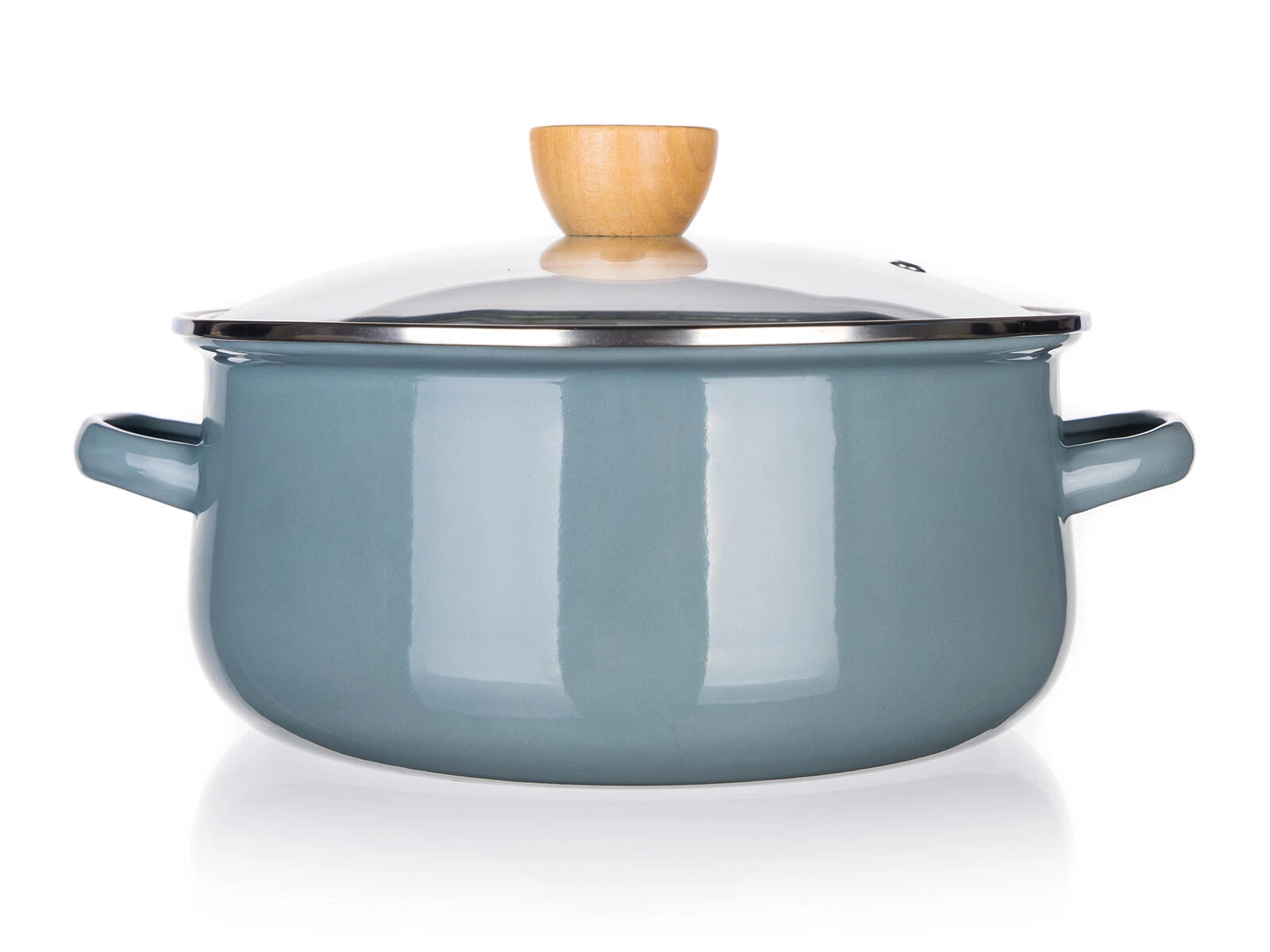 Elegancki zestaw emaliowanych garnków w naturalnym odcieniu oliwki do codziennego gotowania. Zawiera trzy rozmiary z przezroczystymi szklanymi pokrywkami i solidnymi uchwytami. Trwała, 2-warstwowa emalia SOLID zapewnia długą żywotność, łatwą pielęgnację i równomierne rozprowadzanie ciepła. Garnek można używać również w piekarniku bez szklanej pokrywki z drewnianym gałką.