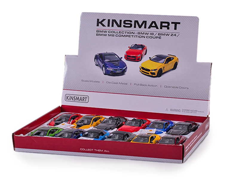 Odkryj realistyczne metalowe modele samochodów Kinsmart w skali 1:38, inspirowane autami BMW i8, Z4 i M8. Każdy model wykonano z wysokiej jakości metalowego stopu z plastikowymi detalami, ma otwierane drzwi oraz napęd typu pull-back zapewniający świetną zabawę. Długość 13 cm i cztery warianty kolorystyczne ucieszą dzieci od 3 lat oraz kolekcjonerów.