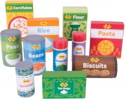 Ożyw dziecięcą kuchnię tym drewnianym zestawem artykułów spożywczych, który obejmuje 11 podstawowych trwałych przedmiotów, takich jak makarony, ryż i ciastka. Świetny dla rozwoju koordynacji i inspiracji do zabawy w różnych rolach.