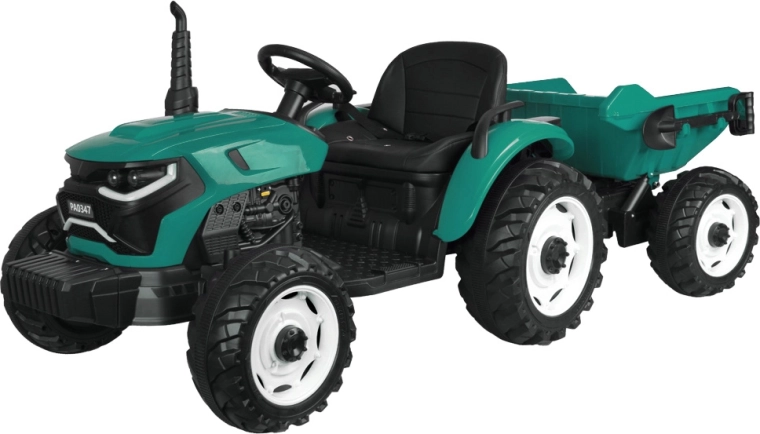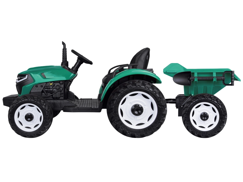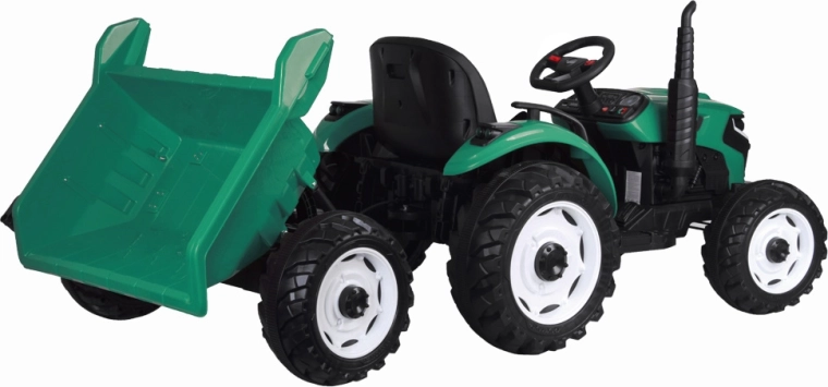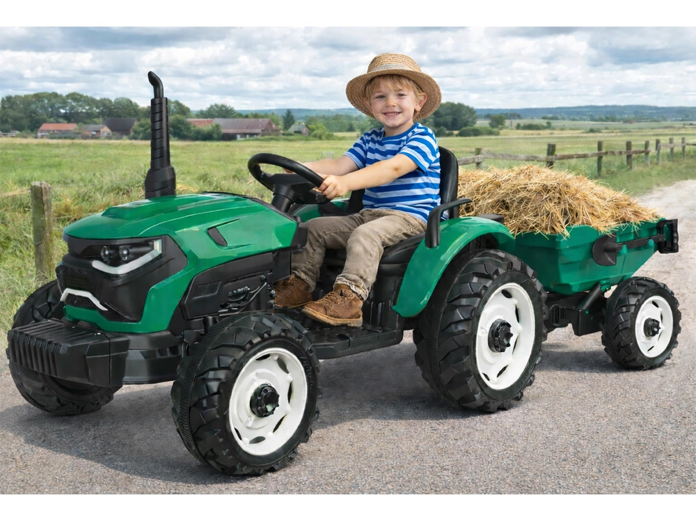 Solidny dziecięcy traktor na akumulator z przyczepą i automatyczną wywrotką zapewnia godziny zabawy w ogrodzie. Dzięki mocnemu napędowi 24V, zdalnemu sterowaniu dla rodziców, efektom świetlnym i dźwiękowym oraz panelowi z USB jazda jest bezpieczna, wygodna i maksymalnie realistyczna.