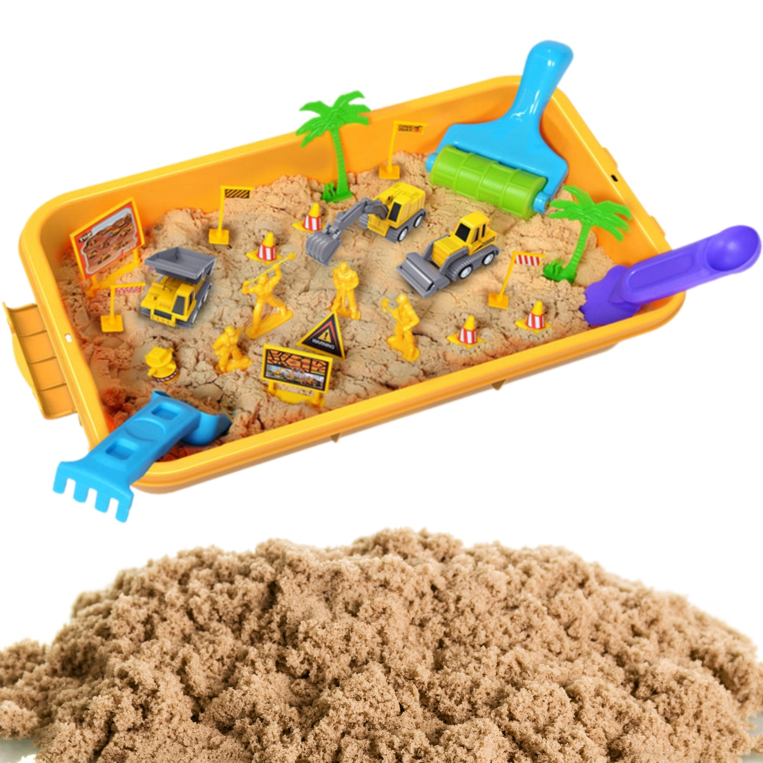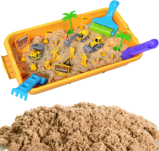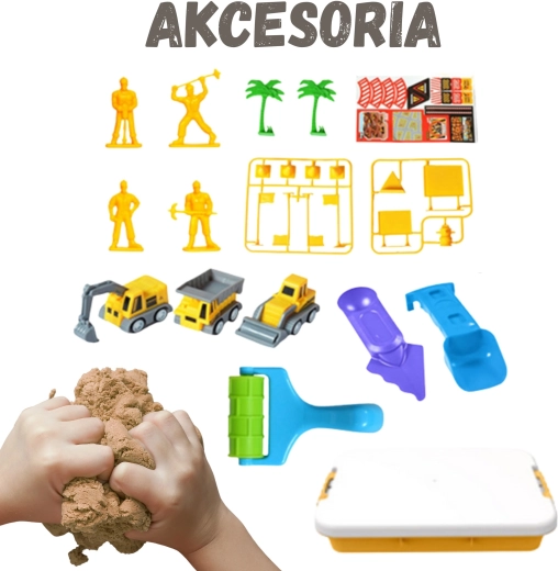- Zawartość opakowania: żółta walizka, 1 000 g piasku kinetycznego (kolor naturalny), 3 pojazdy budowlane, 4 figurki pracowników, elementy drogowe i ostrzegawcze (pachołki, bariery), 2 drzewka (palmy), narzędzia do piasku: łopatka, szpachelka/grabki, ręczny wałek.