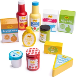 Ten dopracowany drewniany zestaw zawiera wybór lubianych „trwałych” produktów – na przykład keczup, dressing, mleko, sok jabłkowy, pomarańczowy i cytrynowy, dżem, masło, pesto, ser oraz jogurt. Realistyczne kształty i kolorowe etykiety zachęcają dzieci do zabawy, a przy tym w naturalny sposób uczą rozpoznawania produktów i rozmów o zdrowym odżywianiu.