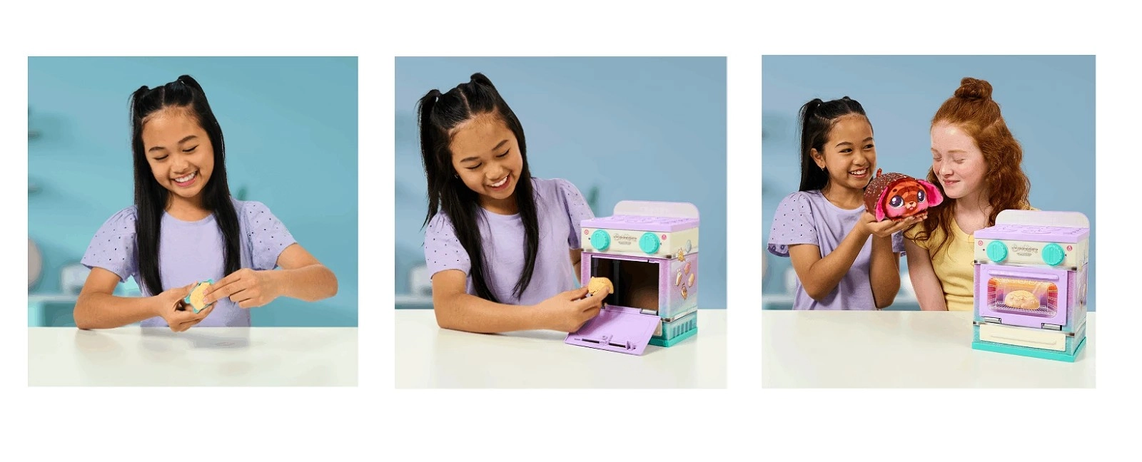 Wymieszaj dołączone „składniki”, uformuj własny wypiek za pomocą foremek i włóż do piekarnika. Po chwili drzwiczki się otworzą, a w środku czeka uroczy, pachnący pluszowy przytulak gotowy do przytulania. Dzieci doświadczą zabawy w gotowanie, radości z odkrywania i ćwiczenia małej motoryki.