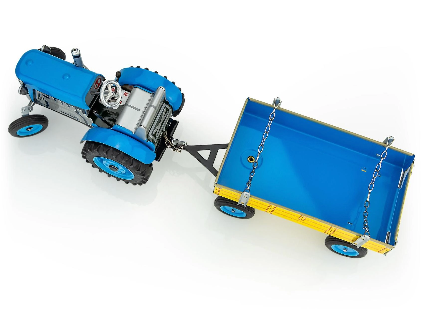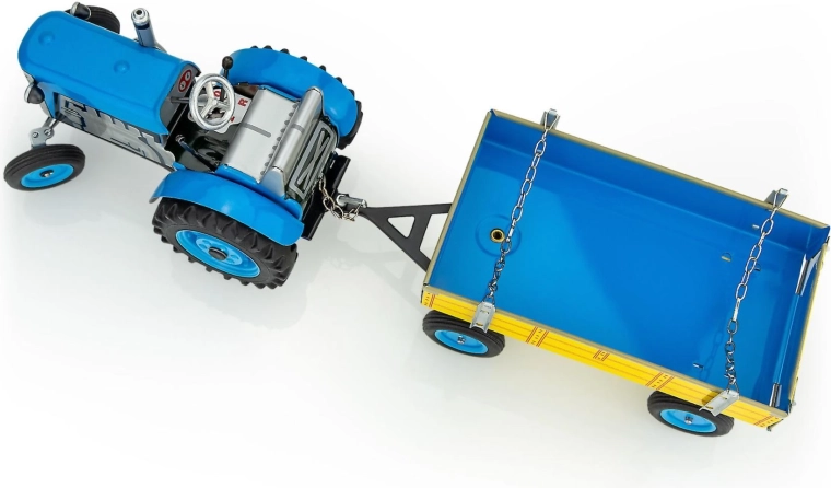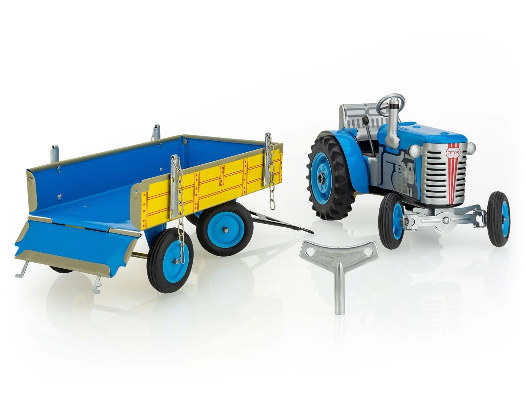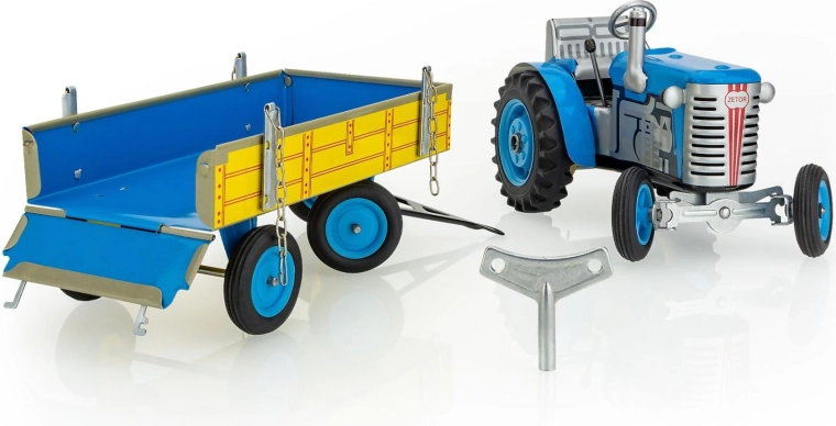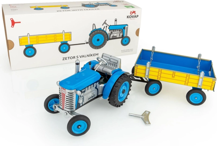 Ten precyzyjnie wykonany metalowy traktor ZETOR z przyczepą od czeskiej marki KOVAP działa na klasyczny nakręcany kluczyk. Dzięki prawdziwej skrzyni biegów i hamulcowi ręcznemu zapewnia realistyczne sterowanie i długie godziny zabawy. Idealny dla dzieci od 3 lat oraz kolekcjonerów tradycyjnych blaszanych zabawek.