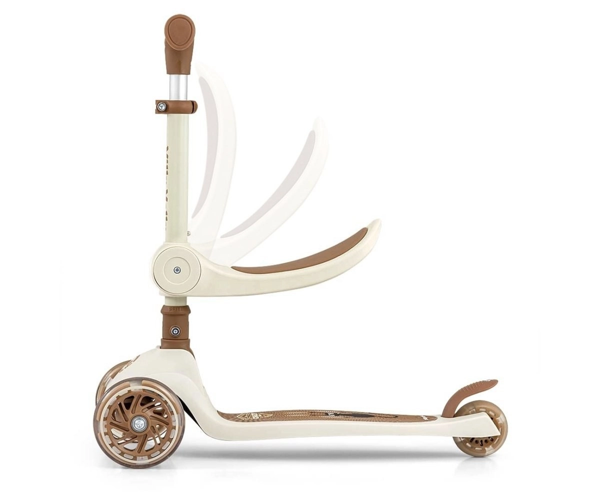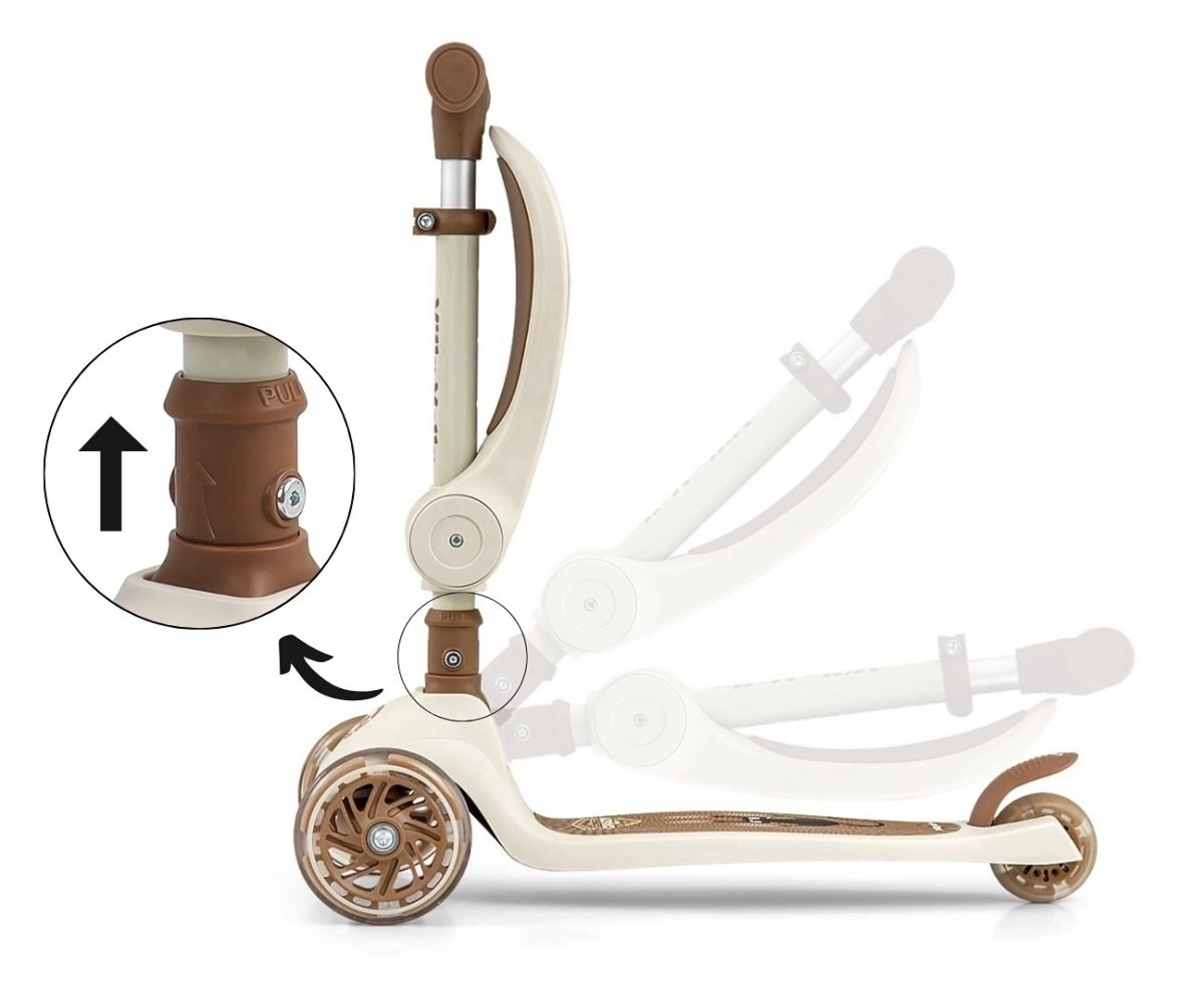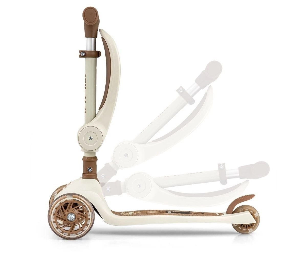 Cztery pozycje wysokości kierownicy T‑bar i praktyczne składane siedzisko umożliwiają wygodne przejście z jeździka na hulajnogę.