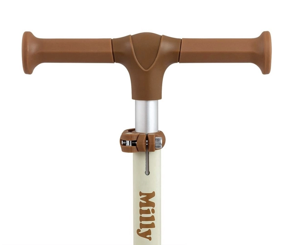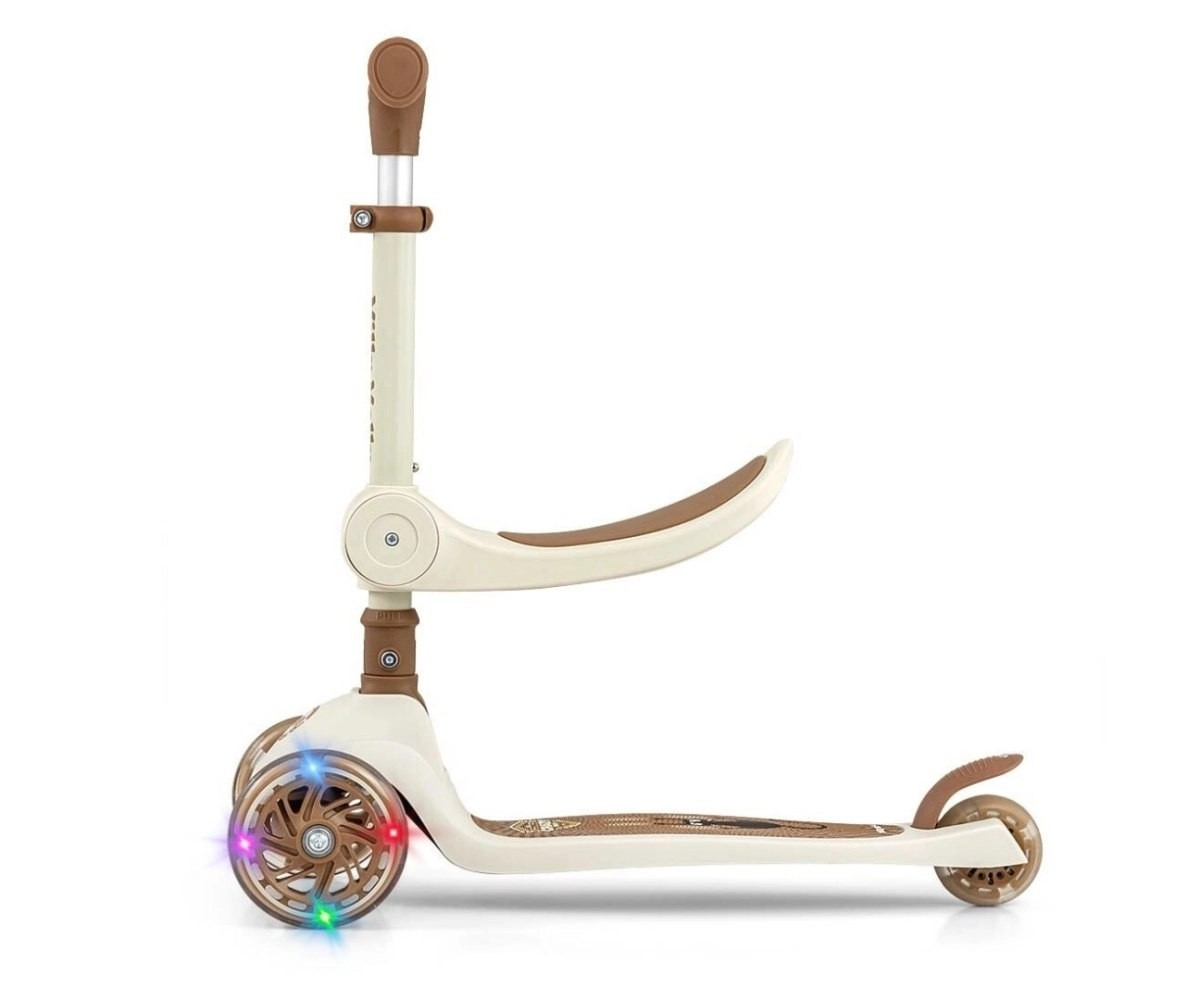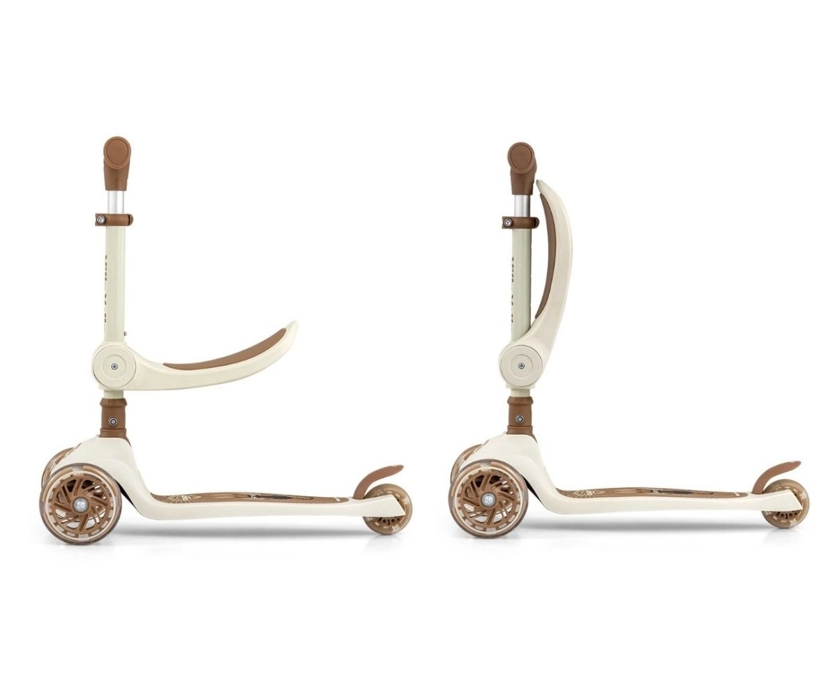 Cztery pozycje wysokości kierownicy T‑bar i praktyczne składane siedzisko umożliwiają wygodne przejście z jeździka na hulajnogę.