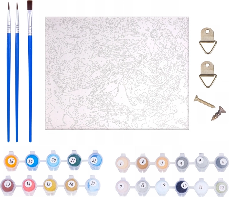 Płótno wykonane jest z materiału o delikatnej strukturze i jest już naciągnięte na drewnianą ramę, więc po ukończeniu wystarczy obraz po prostu zawiesić. W zestawie znajdują się farby akrylowe o dobrej kryjącości oraz 3 różne pędzle nylonowe do detali i większych pociągnięć. Dwa haczyki do zawieszenia ułatwią finalną prezentację.