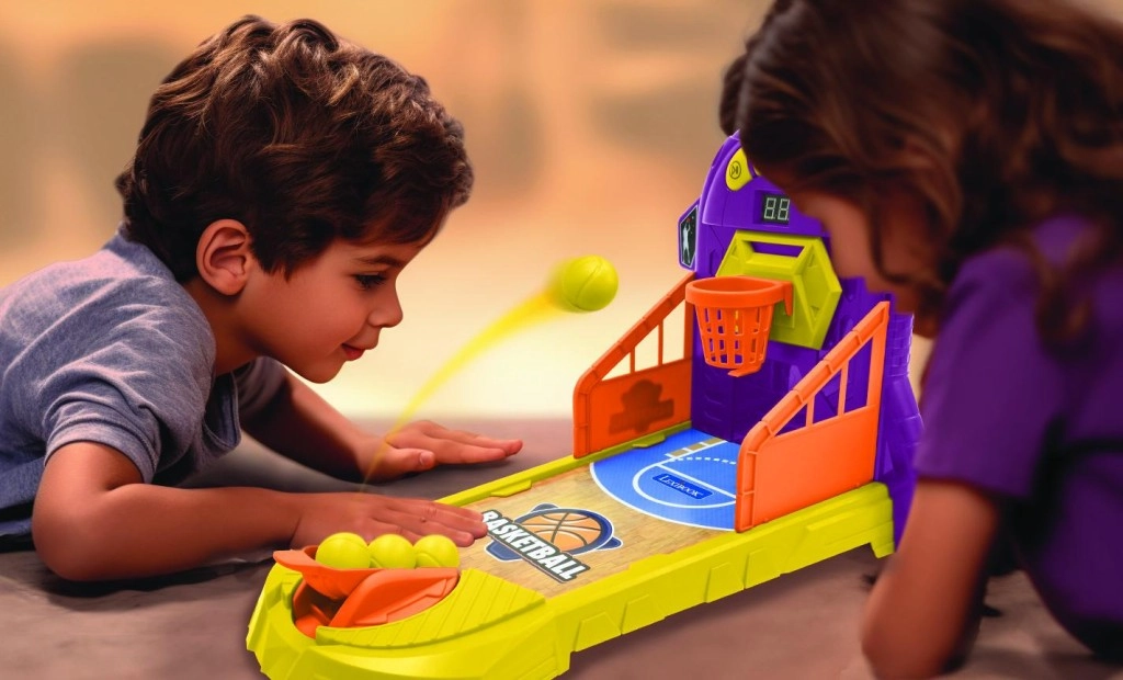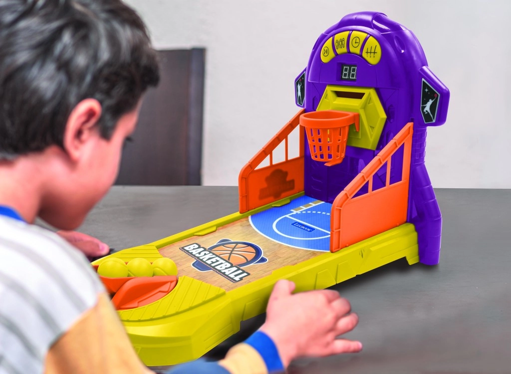Zabawna elektroniczna stołowa gra w koszykówkę dla dzieci od 4 lat oferuje szybkie tempo, rywalizację i trening celności w kompaktowej formie. Dzięki elektronicznemu licznikowi punktów, efektom świetlnym i dźwiękowym oraz trzem poziomom trudności spodoba się zarówno początkującym, jak i zaawansowanym. Kolorowy design z ochronnymi bandami utrzymuje piłeczki w grze, a mechaniczna wyrzutnia gwarantuje łatwe i przyjemne strzały.