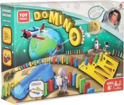 Zawartość opakowania: 126× klocki domina (4 kolory), 2× samolot z wyrzutnią, elementy tras, 2× kulka, 1× figurka, 12× podstawka pod domino, 52× edukacyjne naklejki (litery, liczby, znaki matematyczne).