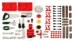 Kompletne wyposażenie, w tym śrubokręty, klucz, poziomica, szczypce, pilnik, młotek, piła, kątownik, śruby, nakrętki i listwy konstrukcyjne. Dzieci mają wszystko, czego potrzebują do pierwszych projektów i nauki przez zabawę.