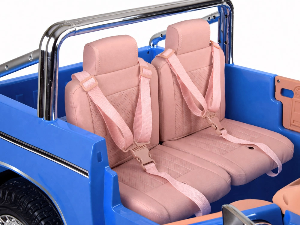 Przestronne siedzenie dla dwojga dzieci, 2-punktowe pasy i kierownica po lewej stronie jak w prawdziwym aucie. Idealne dla rodzeństwa i przyjaciół.