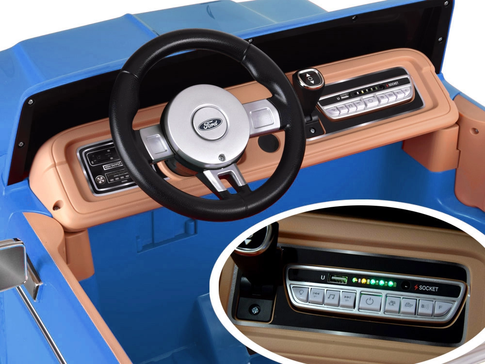 Za płynną i bezpieczną jazdę odpowiadają piankowe koła EVA zapewniające cichą pracę, funkcja łagodnego startu, automatyczny hamulec po zwolnieniu gazu, a nawet oddzielny pedał hamulca. Dwa niezależne 2‑punktowe pasy trzymają dzieci bezpiecznie w fotelach. Panel multimedialny oferuje Start/Stop z realistycznym dźwiękiem silnika, Bluetooth, radio FM, USB/MP3, wbudowane melodie i regulację głośności.
