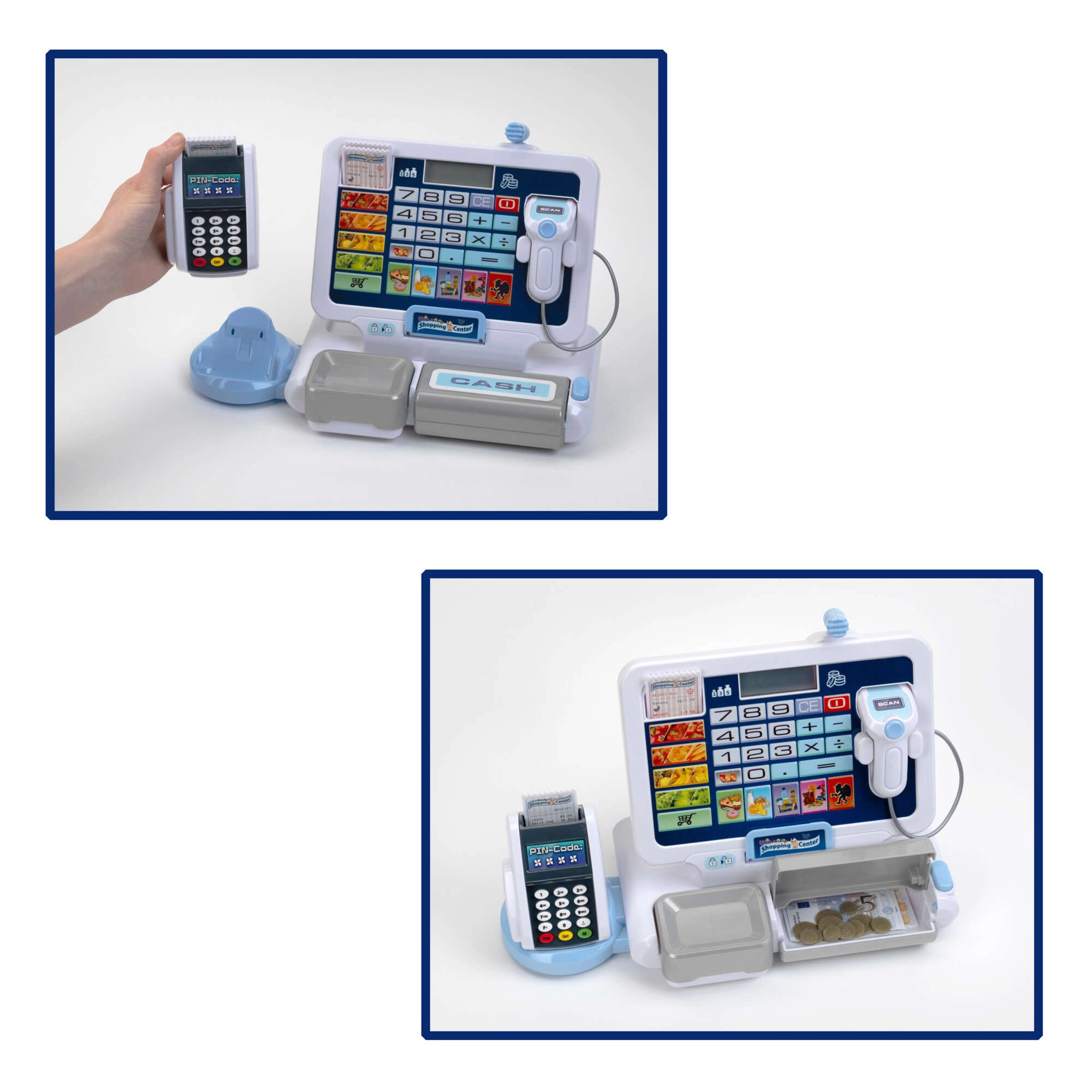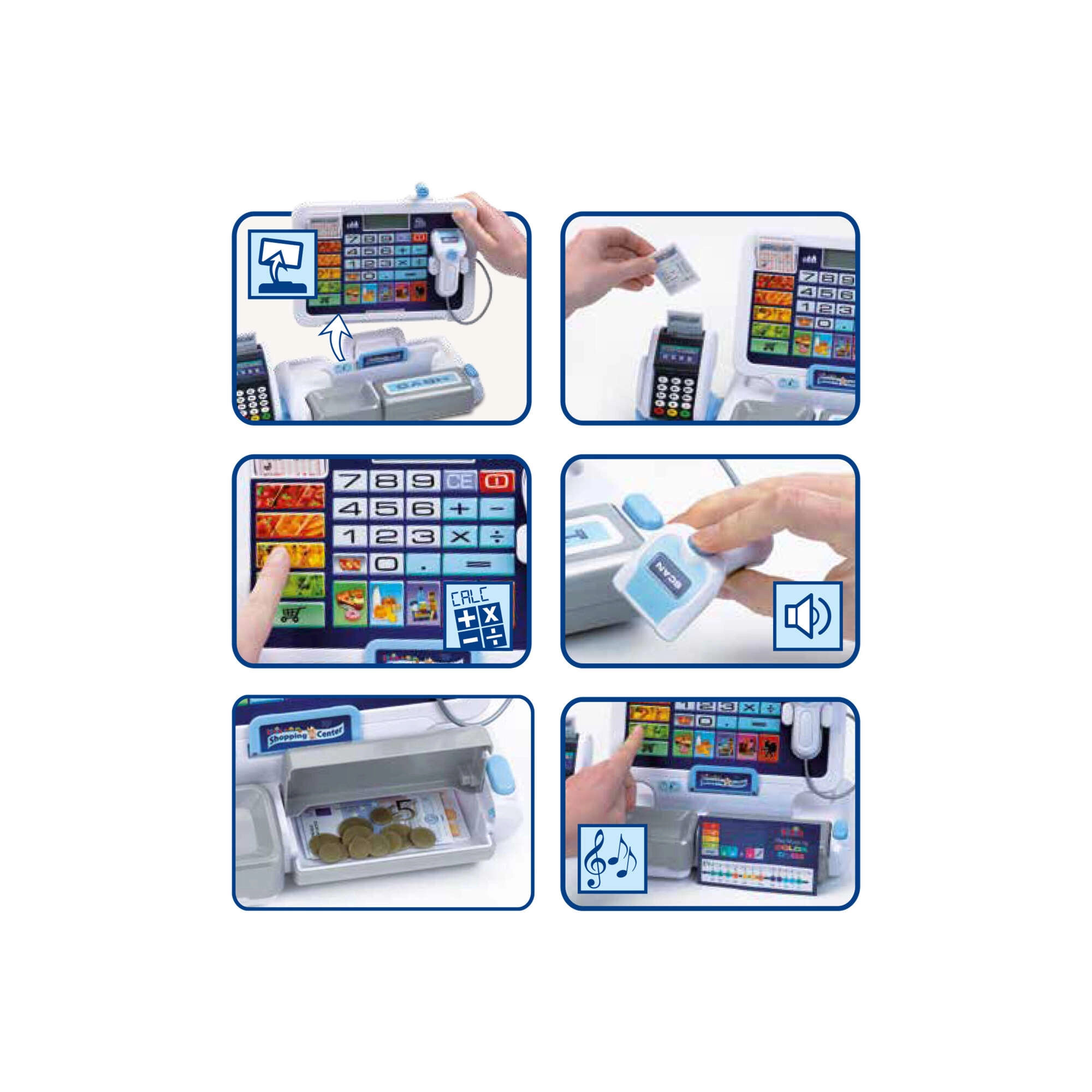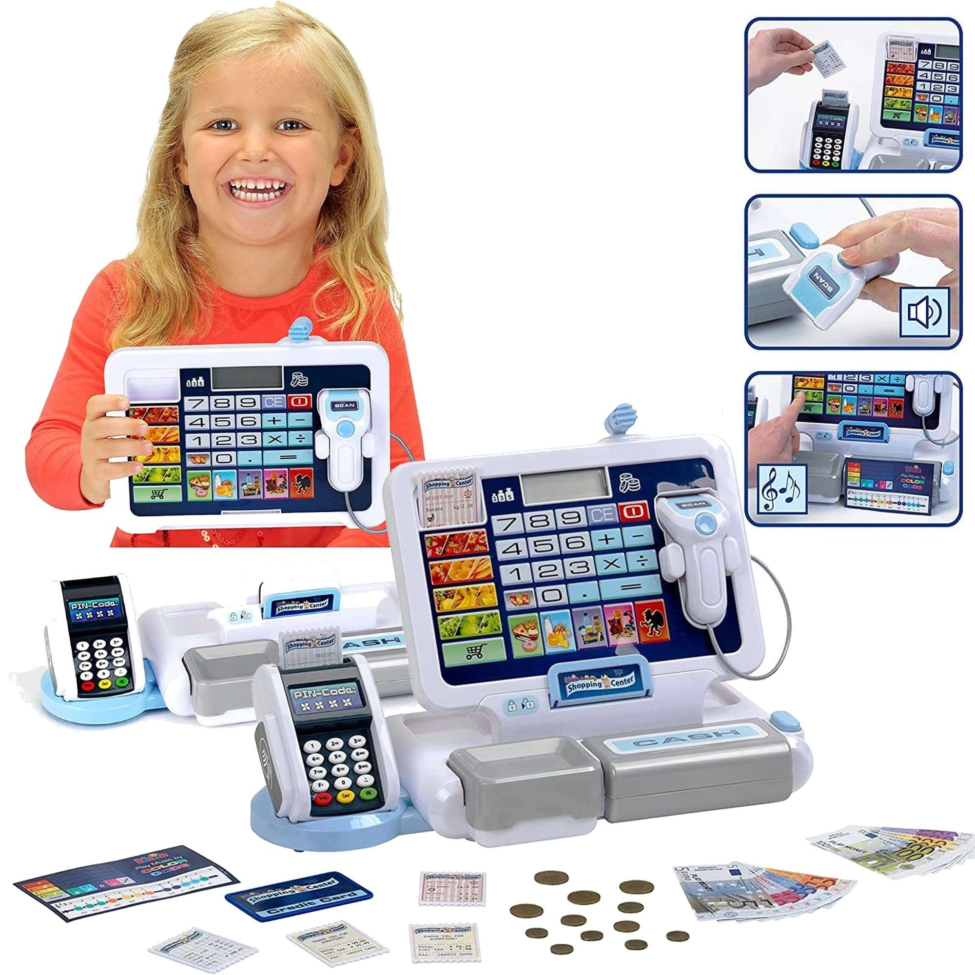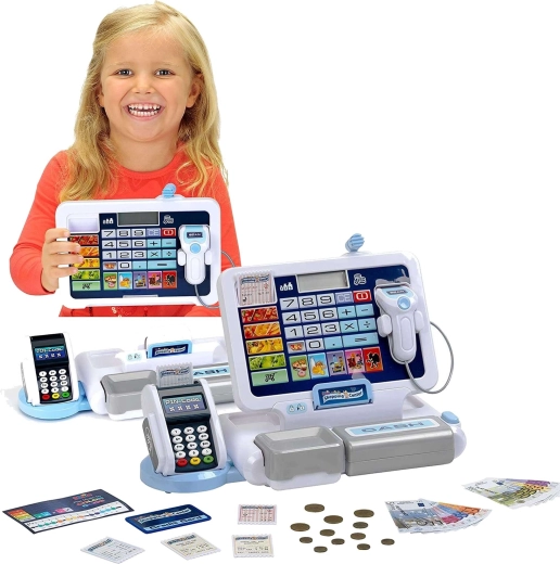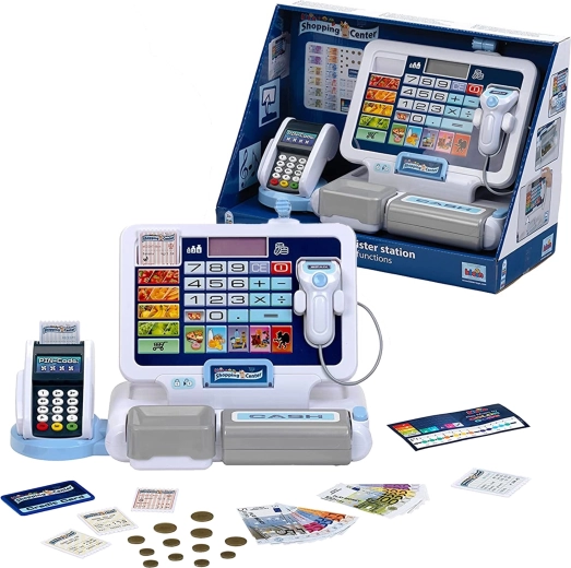 - Realistyczne funkcje: wyświetlacz z kalkulatorem, skaner, czytnik kart, dźwięki kasy.