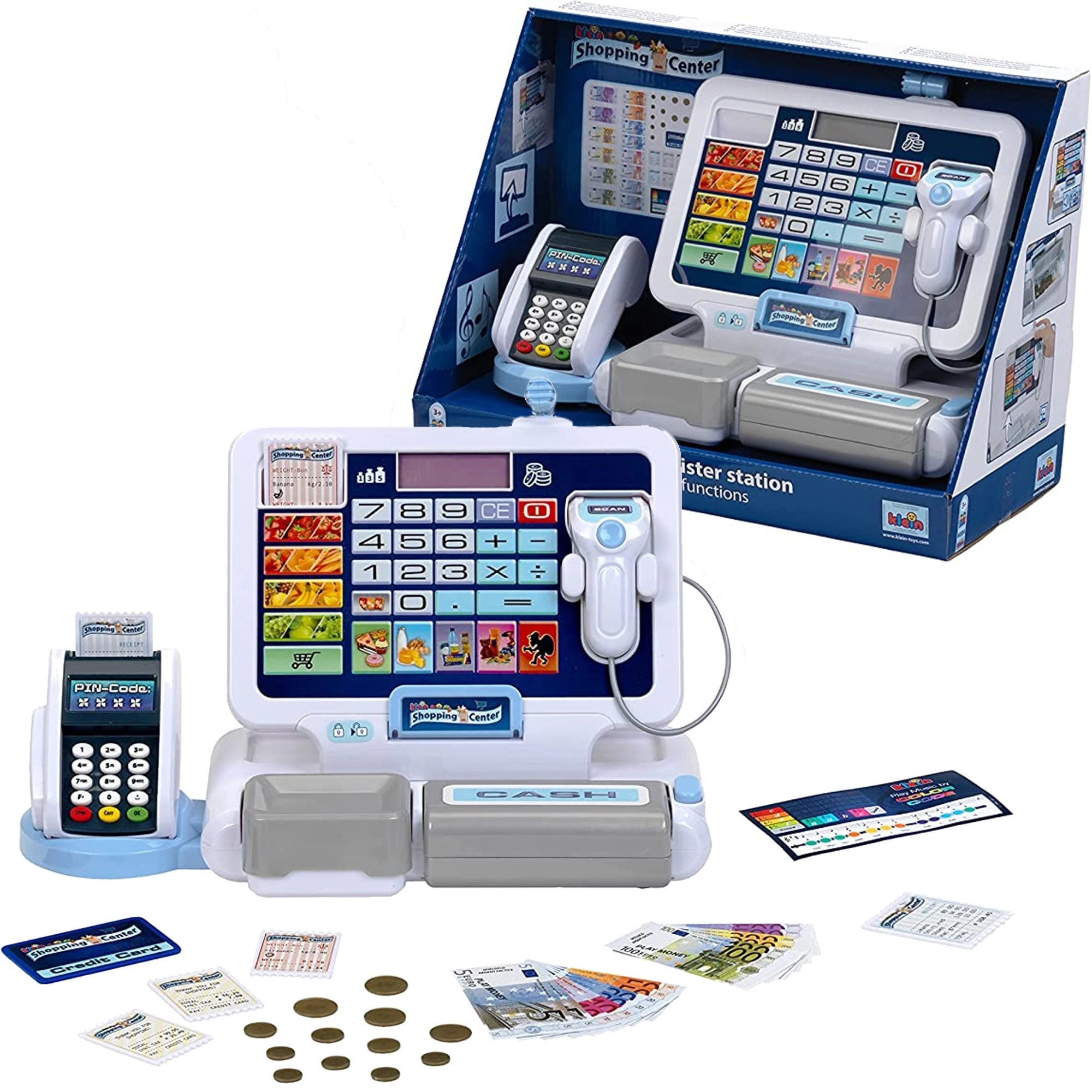 Realistyczna dziecięca kasa z terminalem i skanerem marki KLEIN zapewnia autentyczną zabawę w sklep. Oferuje działający wyświetlacz z kalkulatorem, otwierany szufladę na pieniądze, czytnik kart, efekty dźwiękowe oraz bogate akcesoria, w tym monety i banknoty euro, paragony oraz „kredytową” kartę – idealna do rozwijania liczenia, kompetencji finansowych i zabawy w odgrywanie ról.