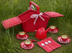 Urokliwy kosz piknikowy z motywem kropek i serduszek mieści metalowy zestaw do herbaty, gotowy na każdą wyimaginowaną herbatkę. Solidne wykonanie z regulowanymi paskami na rzep i materiałową lamówką zapewnia łatwe przenoszenie i przechowywanie wszystkich elementów. Dzieci ćwiczą interakcje społeczne, motorykę oraz kreatywność.