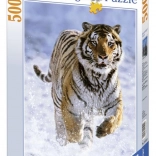 Puzzle przedstawiają piękny obraz tygrysa w ruchu na śniegu, który przyciąga uwagę kontrastującymi kolorami.
