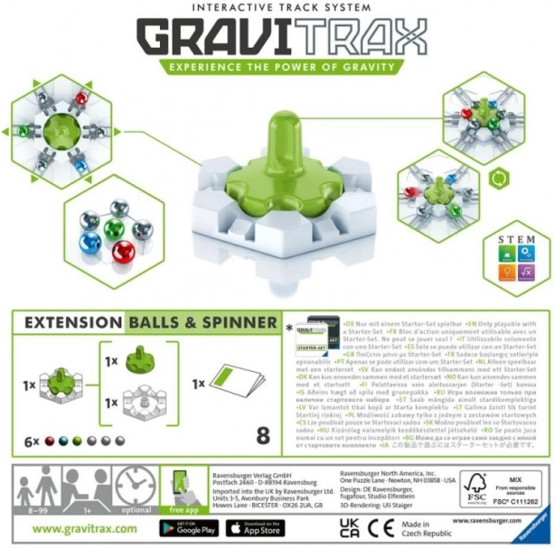 W opakowaniu znajdują się 3 srebrne i 3 kolorowe kulki, więc od razu dodasz do zabawy więcej prędkości i efektów. Rozszerzenie jest kompatybilne wyłącznie z zestawem startowym GraviTrax, z którym idealnie wpasuje się w Twoje konstrukcje.