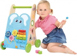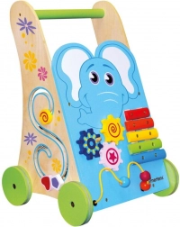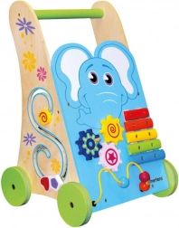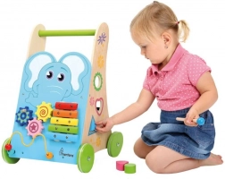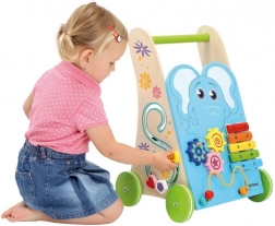 Wesprzyj pierwsze kroki i ciekawość swojego dziecka dzięki temu wysokiej jakości drewnianemu chodzikowi ze słoniem. Oferuje ksylofon o delikatnym brzmieniu, labirynt z koralikami, układankę–sorter kształtów oraz zębate kółka dla zabawy i rozwoju motoryki. Ciche gumowe koła chronią podłogę, a stabilna konstrukcja z drewna FSC zapewnia bezpieczną zabawę od 18 miesięcy.