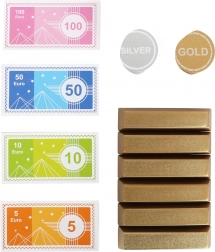 W zestawie znajdują się banknoty euro, złote i srebrne monety oraz drewniane sztabki złota. Świetne do nauki wartości pieniędzy, liczenia i odgrywania ról bankierów oraz klientów.