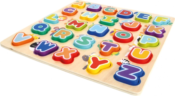 - Drewniane puzzle do wkładania z angielskim alfabetem