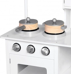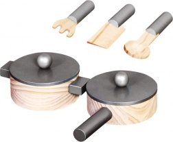 W komplecie znajduje się również zestaw garnków, łyżka do mieszania i widelec, które wzbogacą zabawę.