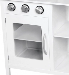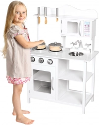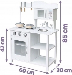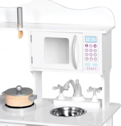 Kuchnia zawiera zlew, kuchenkę i kuchenkę mikrofalową, co zapewnia pełną zabawę w gotowanie.