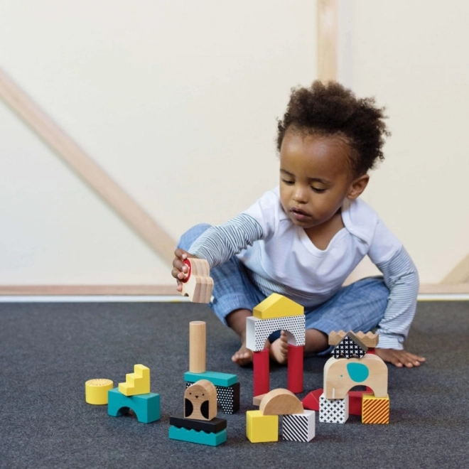 Różne kształty i rozmiary klocków zachęcają do wznoszenia wież, mostów oraz tworzenia zwierzęcych opowieści. Zabawa naturalnie rozwija małą motorykę i koordynację ręka-oko.