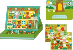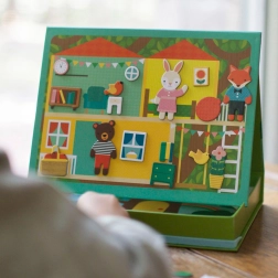 Magnetyczny teatr Zwierzęcy Dom Petit Collage daje dzieciom nieskończone możliwości łączenia i tworzenia scen – od przytulnego zwierzęcego domku po uroczy piknik w parku. Dzięki ogranicznikom magnetyczną scenę można łatwo ustawić, a pudełko w mgnieniu oka zamienia się w praktyczny teatrzyk.